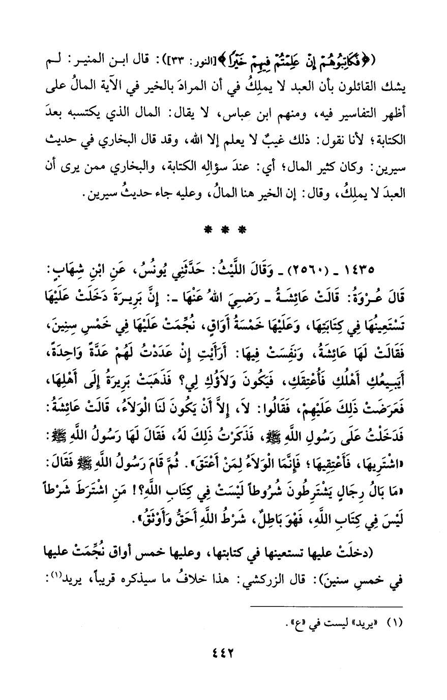 1435 - (2560) - وَقَالَ اللَّيْثُ: حَدَّثَنِي يُونُسُ، عَنِ ابْنِ شِهَابٍ: قَالَ عُرْوَةُ: قَالَتْ عَائِشَةُ -رَضِيَ اللهُ عَنْهَا -: إِنَّ بَرِيرَةَ دَخَلَتْ عَلَيْهَا تَسْتَعِينُهَا فِي كِتَابَتِهَا، وَعَلَيْهَا خَمْسَةُ أَوَاقٍ، نُجِّمَتْ عَلَيْهَا فِي خَمْسِ سِنِينَ، فَقَالَتْ لَهَا عَائِشَةُ، وَنَفِسَتْ فِيهَا: أَرَأَيْتِ إِنْ عَدَدْتُ لَهُمْ عَدَّةً وَاحِدَةً، أَيَبِيعُكِ أَهْلُكِ فَأُعْتِقَكِ، فَيَكُونَ وَلاَؤُكِ لِي؟ فَذَهَبَتْ بَرِيرَةُ إِلَى أَهْلِهَا، فَعَرَضَتْ ذَلِكَ عَلَيْهِمْ، فَقَالُوا: لَا، إِلَّا أَنْ يَكُونَ لنَاَ الْوَلَاءُ، قَالَتْ عَائِشَةُ: فَدَخَلْتُ عَلَى رَسُولِ اللهِ - صلى الله عليه وسلم - فَذَكَرْتُ ذَلِكَ لَهُ، فَقَالَ لَهَا رَسُولُ اللهِ - صلى الله عليه وسلم -: "اشْتَرِيهَا، فَأَعْتِقِيهَا؛ فَإِنَّمَا الْوَلاَءُ لِمَنْ أَعْتَقَ". ثُمَّ قَامَ رَسُولُ اللهِ - صلى الله عليه وسلم - فَقَالَ: "مَا بَالُ رِجَالٍ يَشْتَرِطُونَ شُرُوطاً لَيْسَتْ فِي كِتَابِ اللهِ؟! مَنِ اشْتَرَطَ شَرْطاً لَيْسَ فِي كِتَابِ اللهِ، فَهْوَ بَاطِلٌ، شَرْطُ اللهِ أَحَقُّ وَأَوْثَقُ".
