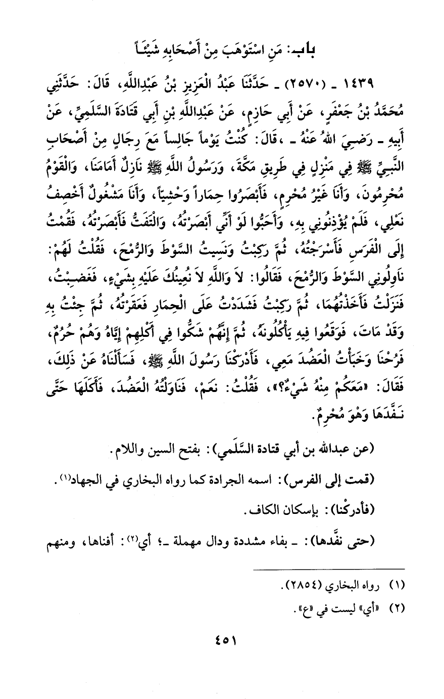 1439 - (2570) - حَدَّثَنَا عَبْدُ الْعَزِيزِ بْنُ عَبْدِ اللهِ، قَالَ: حَدَّثَنِي مُحَمَّدُ بْنُ جَعْفَرٍ، عَنْ أَبِي حَازِمٍ، عَنْ عَبْدِ اللهِ بْنِ أَبِي قَتَادَةَ السَّلَمِيِّ، عَنْ أَبِيهِ -رَضِيَ اللهُ عَنْهُ-، قَالَ: كُنْتُ يَوْماً جَالِساً مَعَ رِجَالٍ مِنْ أَصْحَابِ النَّبِيِّ - صلى الله عليه وسلم - فِي مَنْزِلٍ فِي طَرِيقِ مَكَّةَ، وَرَسُولُ اللهِ - صلى الله عليه وسلم - نَازِلٌ أَمَامَنَا، وَالْقَوْمُ مُحْرِمُونَ، وَأَنَا غَيْرُ مُحْرِمٍ، فَأَبْصَرُوا حِمَارًا وَحْشِيّاً، وَأَنَا مَشْغُولٌ أَخْصِفُ نَعْلِي، فَلَمْ يُؤْذِنُونِي بِهِ، وَأَحَبُّوا لَوْ أَنِّي أَبْصَرْتُهُ، وَالْتَفَتُّ فَأَبْصَرْتُهُ، فَقُمْتُ إِلَى الْفَرَسِ فَأَسْرَجْتُهُ، ثُمَّ رَكِبْتُ وَنَسِيتُ السَّوْطَ وَالرُّمْحَ، فَقُلْتُ لَهُمْ: نَاوِلُونِي السَّوْطَ وَالرُّمْحَ، فَقَالُوا: لاَ وَاللهِ لاَ نُعِينُكَ عَلَيْهِ بِشَيْءٍ، فَغَضِبْتُ، فَنَزَلْتُ فَأَخَذْتُهُمَا، ثُمَّ رَكِبْتُ فَشَدَدْتُ عَلَى الْحِمَارِ فَعَقَرْتُهُ، ثُمَّ جِئْتُ بِهِ وَقَدْ مَاتَ، فَوَقَعُوا فِيهِ يَأَكُلُونَهُ، ثُمَّ إِنَّهُمْ شَكُّوا فِي أَكْلِهِمْ إِيَّاهُ وَهُمْ حُرُمٌ، فَرُحْنَا وَخَبَأْتُ الْعَضُدَ مَعِي، فَأَدْرَكْنَا رَسُولَ اللهِ - صلى الله عليه وسلم -، فَسَأَلْنَاهُ عَنْ ذَلِكَ، فَقَالَ: "مَعَكُمْ مِنْهُ شَيْءٌ؟ "، فَقُلْتُ: نَعَمْ، فَنَاوَلْتُهُ الْعَضُدَ، فَأَكَلَهَا حَتَّى نَفَّدَهَا وَهْوَ مُحْرِمٌ.