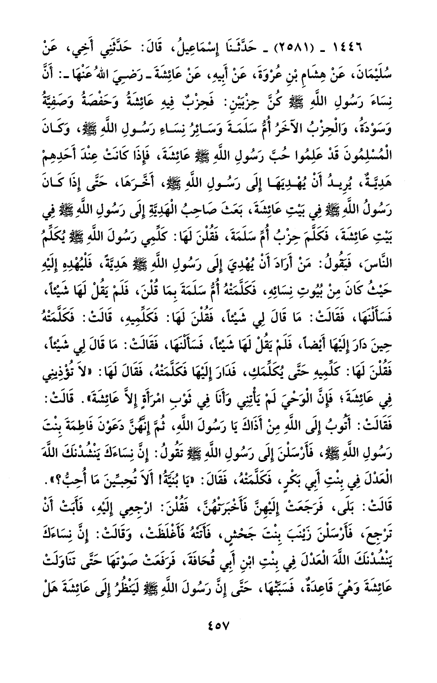 1446 - (2581) - حَدَّثَنَا إِسْمَاعِيلُ، قَالَ: حَدَّثَنِي أَخِي، عَنْ سُلَيْمَانَ، عَنْ هِشَامِ بْنِ عُرْوَةَ، عَنْ أَبِيهِ، عَنْ عَائِشَةَ -رَضِيَ اللهُ عَنْهَا-: أَنَّ نِسَاءَ رَسُولِ اللهِ - صلى الله عليه وسلم - كُنَّ حِزْبَيْنِ: فَحِزْبٌ فِيهِ عَائِشَةُ وَحَفْصَةُ وَصَفِيَّةُ وَسَوْدَةُ، وَالْحِزْبُ الآخَرُ أُمُّ سَلَمَةَ وَسَائِرُ نِسَاءَ رَسُولِ اللهِ - صلى الله عليه وسلم -، وَكَانَ الْمُسْلِمُونَ قَدْ عَلِمُوا حُبَّ رَسُولِ اللهِ - صلى الله عليه وسلم - عَائِشَةَ، فَإِذَا كَانَتْ عِنْدَ أَحَدِهِمْ هَدِيَّةٌ، يُرِيدُ أَنْ يُهْدِيَهَا إِلَى رَسُولِ اللهِ - صلى الله عليه وسلم -، أَخَّرَهَا، حَتَّى إِذَا كَانَ رَسُولُ اللهِ - صلى الله عليه وسلم - فِي بَيْتِ عَائِشَةَ، بَعَثَ صَاحِبُ الْهَدِيَّةِ إِلَى رَسُولِ اللهِ - صلى الله عليه وسلم - فِي بَيْتِ عَائِشَةَ، فَكَلَّمَ حِزْبُ أُمِّ سَلَمَةَ، فَقُلْنَ لَهَا: كَلِّمِي رَسُولَ اللهِ - صلى الله عليه وسلم - يُكَلِّمُ النَّاسَ، فَيَقُولُ: مَنْ أَرَادَ أَنْ يُهْدِيَ إِلَى رَسُولِ اللهِ - صلى الله عليه وسلم - هَدِيَّةً، فَلْيُهْدِهِ إِلَيْهِ حَيْثُ كَانَ مِنْ بُيُوتِ نِسَائِهِ، فَكَلَّمَتْهُ أُمُّ سَلَمَةَ بِمَا قُلْنَ، فَلَمْ يَقُلْ لَهَا شَيْئًا، فَسَأَلْنَهَا، فَقَالَتْ: مَا قَالَ لِي شَيْئاً، فَقُلْنَ لَهَا: فَكَلِّمِيهِ، قَالَتْ: فَكَلَّمَتْهُ حِينَ دَارَ إِلَيْهَا أَيْضاً، فَلَمْ يَقُلْ لَهَا شَيْئاً، فَسَأَلْنَهَا، فَقَالَتْ: مَا قَالَ لِي شَيْئاً، فَقُلْنَ لَهَا: كَلِّمِيهِ حَتَّى يُكَلِّمَكِ، فَدَارَ إِلَيْهَا فَكَلَّمَتْهُ، فَقَالَ لَهَا: "لا تُؤْذِينِي فِي عَائِشَةَ؛ فَإِنَّ الْوَحْيَ لَمْ يَأْتِنِي وَأَنَا فِي ثَوْبِ امْرَأَةٍ إِلَّا عَائِشَةَ". قَالَتْ: فَقَالَتْ: أَتُوبُ إِلَى اللهِ مِنْ أَذَاكَ يَا رَسُولَ اللهِ، ثُمَّ إِنَّهُنَّ دَعَوْنَ فَاطِمَةَ بِنْتَ رَسُولِ اللهِ - صلى الله عليه وسلم -، فَأَرْسَلْنَ إِلَى رَسُولِ اللهِ - صلى الله عليه وسلم - تَقُولُ: إِنَّ نِسَاءَكَ يَنْشُدْنَكَ اللهَ الْعَدْلَ فِي بِنْتِ أَبِي بَكْرٍ، فَكَلَّمَتْهُ، فَقَالَ: "يَا بُنَيَّةُ! أَلَا تُحِبِّينَ مَا أُحِبُّ؟ ". قَالَتْ: بَلَى، فَرَجَعَتْ إِلَيْهِنَّ فَأَخْبَرَتهُنَّ، فَقُلْنَ: ارْجِعِي إِلَيْهِ، فَأَبَتْ أَنْ تَرْجِعَ، فَأَرْسَلْنَ زَيْنَبَ بِنْتَ جَحْشٍ، فَأَتَتْهُ فَأَغْلَظَتْ، وَقَالَتْ: إِنَّ نِسَاءَكَ يَنْشُدْنَكَ اللهَ الْعَدْلَ فِي بِنْتِ ابْنِ أَبِي قُحَافَةَ، فَرَفَعَتْ صَوْتَهَا حَتَّى تَنَاوَلَتْ عَائِشَةَ وَهْيَ قَاعِدَةٌ، فَسَبَّتْهَا، حَتَّى إِنَّ رَسُولَ اللهِ - صلى الله عليه وسلم - لَيَنْظُرُ إِلَى عَائِشَةَ هَلْ