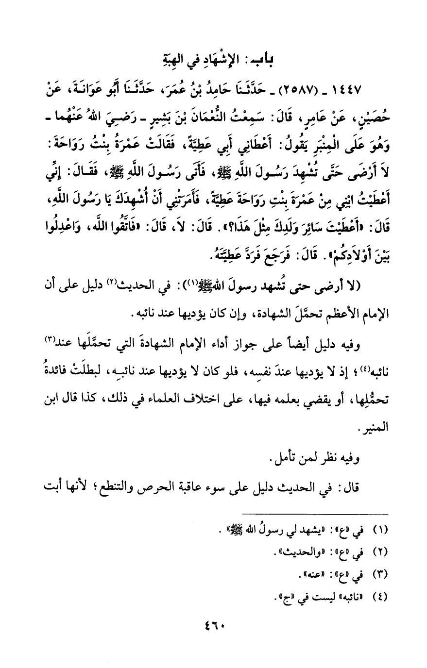 1447 - (2587) - حَدَّثَنَا حَامِدُ بْنُ عُمَرَ، حَدَّثَنَا أَبُو عَوَانَةَ، عَنْ حُصَيْنٍ، عَنْ عَامِرٍ، قَالَ: سَمِعْتُ النُّعْمَانَ بْنَ بَشِيرٍ -رَضِيَ اللهُ عَنْهُما- وَهُوَ عَلَى الْمِنْبَرِ يَقُولُ: أَعْطَانِي أَبِي عَطِيَّةً، فَقَالَتْ عَمْرَةُ بِنْتُ رَوَاحَةَ: لا أَرْضَى حَتَّى تُشْهِدَ رَسُولَ اللهِ - صلى الله عليه وسلم -، فَأَتَى رَسُولَ اللهِ - صلى الله عليه وسلم -، فَقَالَ: إنِّي أَعْطَيْتُ ابْنِي مِنْ عَمْرَةَ بِنْتِ رَوَاحَةَ عَطِيَّةً، فَأَمَرَتْنِي أَنْ أُشْهِدَكَ يَا رَسُولَ اللهِ، قَالَ: "أَعْطَيْتَ سَائِرَ وَلَدِكَ مِثْلَ هَذَا؟ ". قَالَ: لا، قَالَ: "فَاتَّقُوا الله، وَاعْدِلُوا بَيْنَ أَوْلَادِكُمْ". قَالَ: فَرَجَعَ فَرَدَّ عَطِيَّتَهُ.