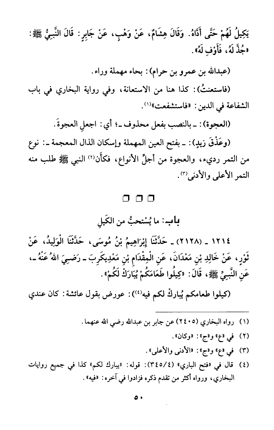 1214 - (2128) - حَدَّثَنَا إِبْرَاهِيمُ بْنُ مُوسَى، حَدَّثَنَا الْوَلِيدُ، عَنْ ثَوْرٍ، عَنْ خَالِدِ بْنِ مَعْدَانَ، عَنِ الْمِقْدَامِ بْنِ مَعْدِ يكَرِبَ -رَضِيَ اللهُ عَنْهُ-، عَنِ النَّبِيِّ - صلى الله عليه وسلم -، قَالَ: "كيلُوا طَعَامَكُمْ يُبَارَكْ لَكُمْ".