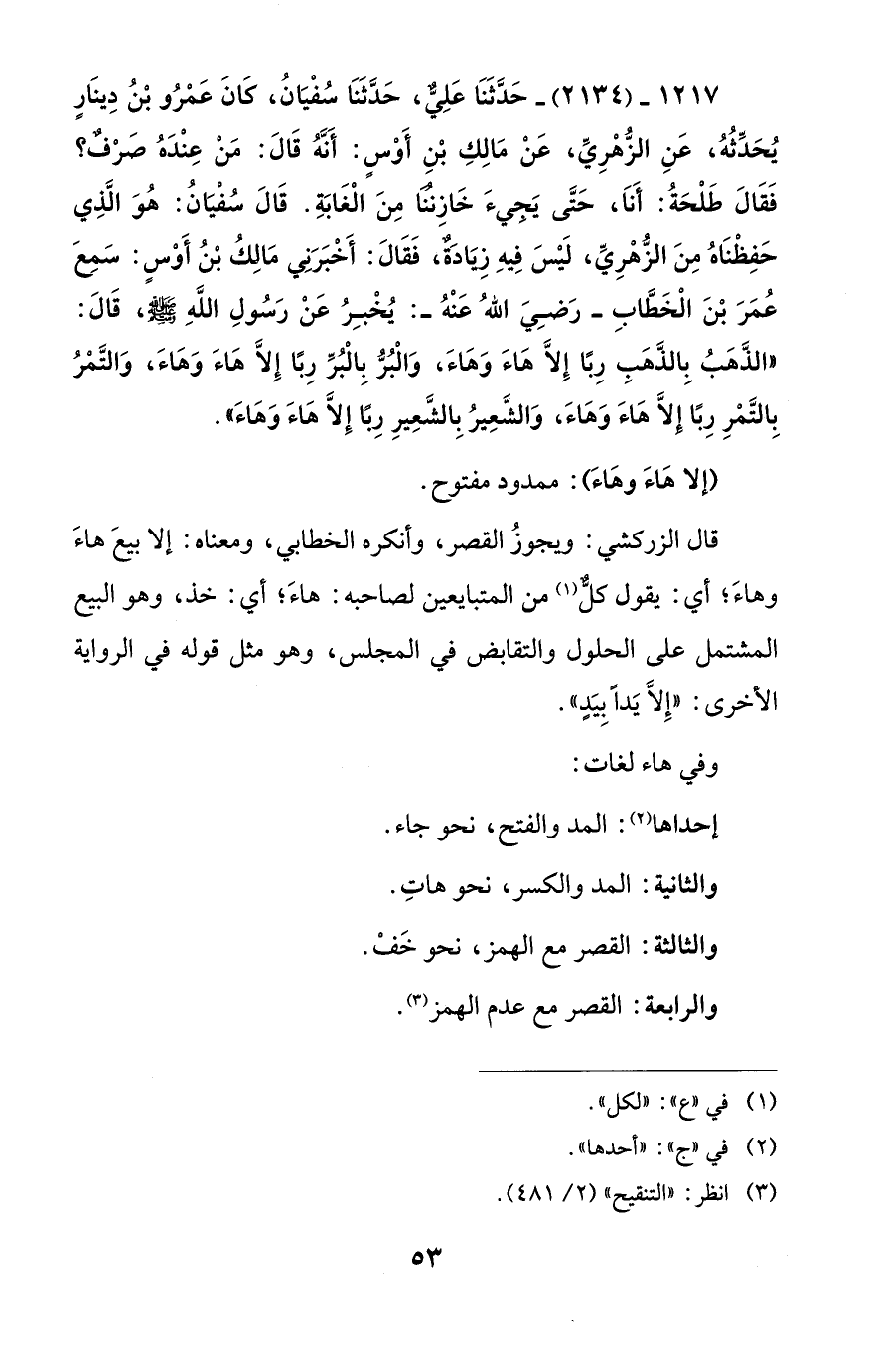 1217 - (2134) - حَدَّثَنَا عَلِيٌّ، حَدَّثَنَا سُفْيَانُ، كَانَ عَمْرُو بْنُ دِينَارٍ يُحَدِّثُهُ، عَنِ الزُّهْرِيِّ، عَنْ مَالِكِ بْنِ أَوْسٍ: أَنَّهُ قَالَ: مَنْ عِنْدَهُ صَرْفٌ؟ فَقَالَ طَلْحَةُ: أَناَ، حَتَّى يَجيءَ خَازِنُنَا مِنَ الْغَابَةِ. قَالَ سُفْيَانُ: هُوَ الَّذِي حَفِظْنَاهُ مِنَ الزُّهْرِيِّ، لَيْسَ فِيهِ زِيَادَةٌ، فَقَالَ: أَخْبَرَنِي مَالِكُ بْنُ أَوْسٍ: سَمِعَ عُمَرَ بْنَ الْخَطَّابِ -رَضِيَ اللهُ عَنْهُ-: يُخْبِرُ عَنْ رَسُولِ اللهِ - صلى الله عليه وسلم -، قَالَ: "الذَّهَبُ بِالذَّهَبِ رِبًا إِلاَّ هَاءَ وَهَاءَ، وَالْبُرُّ بِالْبُرِّ رِبًا إِلاَّ هَاءَ وَهَاءَ، وَالتَّمْرُ بِالتَّمْرِ رِبًا إِلاَّ هَاءَ وَهَاءَ، وَالشَّعِيرُ بِالشَّعِيرِ رِبًا إِلاَّ هَاءَ وَهَاءَ".