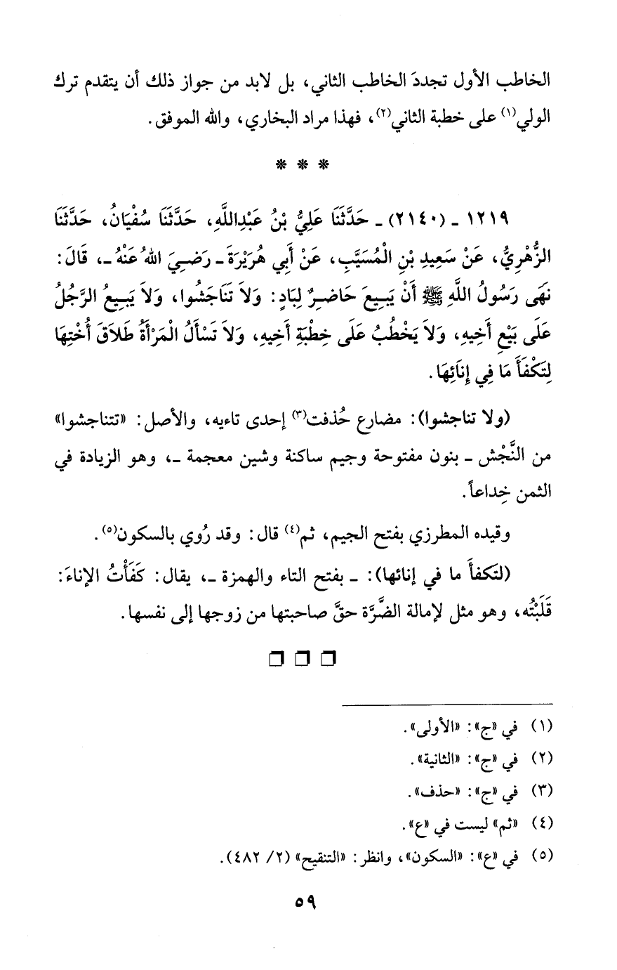 1219 - (2140) - حَدَّثَنَا عَلِيُّ بْنُ عَبْدِ اللهِ، حَدَّثَنَا سُفْيَانُ، حَدَّثَنَا الزُّهْرِيُّ، عَنْ سَعِيدِ بْنِ الْمُسَيَّبِ، عَنْ أَبي هُرَيْرَةَ -رَضِيَ اللهُ عَنْهُ-، قَالَ: نَهَى رَسُولُ اللهِ - صلى الله عليه وسلم - أَنْ يَبِيعَ حَاضِرٌ لِبَادٍ: وَلاَ تَنَاجَشُوا، وَلاَ يَبِيعُ الرَّجُلُ عَلَى بَيع أَخِيهِ، وَلاَ يَخْطُبُ عَلَى خِطْبَةِ أَخِيهِ، وَلاَ تَسْأَلُ الْمَرْأَةُ طَلاَقَ أُخْتِهَا لِتَكْفَأَ مَا فِي إِناَئِهَا.