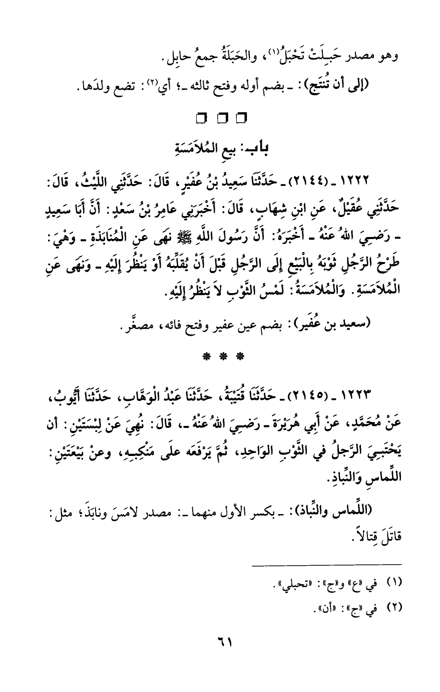 1222 - (2144) - حَدَّثَنَا سَعِيدُ بْنُ عُفَيْرٍ، قَالَ: حَدَّثَنِي اللَّيْثُ، قَالَ: حَدَّثَنِي عُقَيْلٌ، عَنِ ابْنِ شِهَابٍ، قَالَ: أَخْبَرَنِي عَامِرُ بْنُ سَعْدٍ: أَنَّ أَبَا سَعِيدٍ -رَضِيَ اللهُ عَنْهُ- أَخْبَرَهُ: أَنَّ رَسُولَ اللهِ - صلى الله عليه وسلم - نَهَى عَنِ الْمُنَابَذَةِ -وَهْيَ: طَرْحُ الرَّجُلِ ثَوْبَهُ بِالْبَيْعِ إِلَى الرَّجُلِ قَبْلَ أَنْ يُقَلِّبَهُ أَوْ يَنْظُرَ إِلَيْهِ- وَنَهَى عَنِ الْمُلاَمَسَةِ. وَالْمُلاَمَسَةُ: لَمْسُ الثَّوْبِ لاَ يَنْظُرُ إِلَيْهِ.