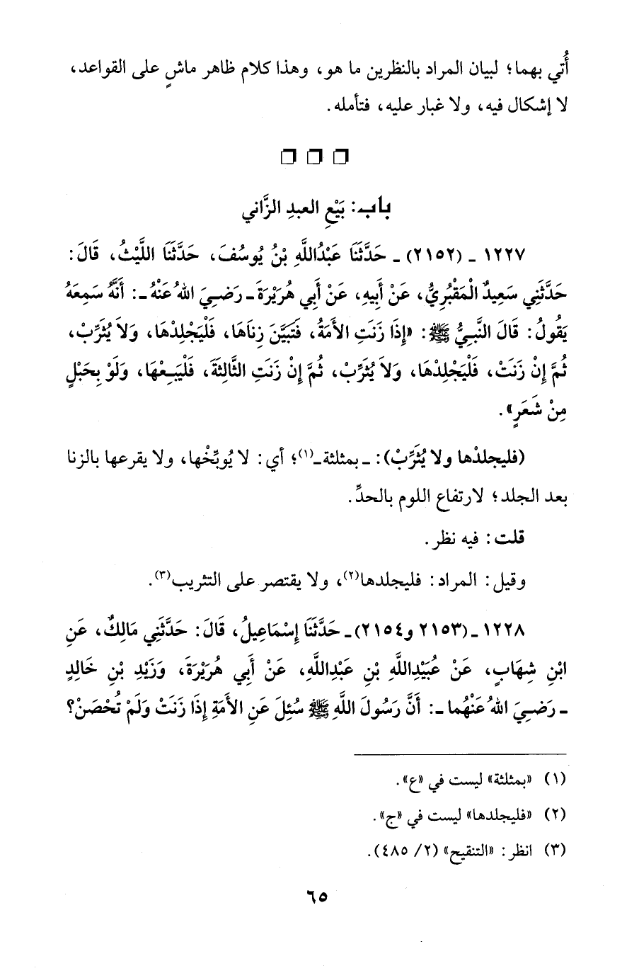 1227 - (2152) - حَدَّثَنَا عَبْدُ اللهِ بْنُ يُوسُفَ، حَدَّثَنَا اللَّيْثُ، قَالَ: حَدَّثَنِي سَعِيدٌ الْمَقْبُرِيُّ، عَنْ أَبِيهِ، عَنْ أَبي هُرَيْرَةَ -رَضِيَ اللهُ عَنْهُ-: أَنَّهُ سَمِعَهُ يَقُولُ: قَالَ النَّبِيُّ - صلى الله عليه وسلم -: "إِذَا زَنَتِ الأَمَةُ، فَتَبَيَّنَ زِناَهَا، فَلْيَجْلِدْهَا، وَلاَ يُثَرِّبْ، ثُمَّ إِنْ زَنَتْ، فَلْيَجْلِدْهَا، وَلاَ يُثَرِّبْ، ثُمَّ إِنْ زَنَتِ الثَّالِثَةَ، فَلْيَبِعْهَا، وَلَوْ بِحَبْلٍ مِنْ شَعَرٍ".