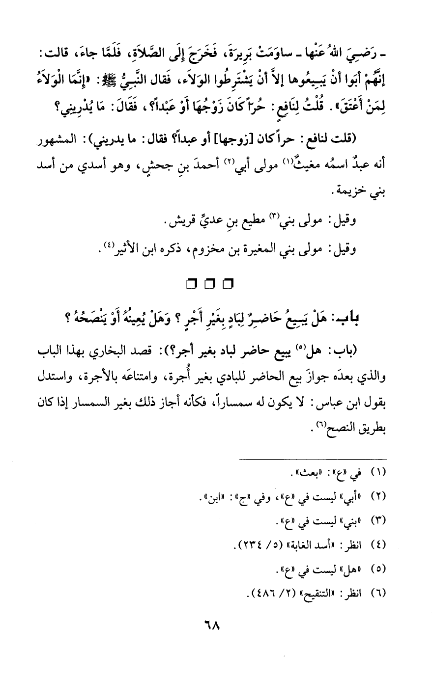 -رَضِيَ اللهُ عَنْها- ساوَمَتْ بَرِيرَةَ، فَخَرَجَ إِلَى الصَّلاَةِ، فَلَمَّا جاءَ، قالت: إنَّهُمْ أبَوا أنْ يَبِيعُوها إلاَّ أنْ يَشْتَرِطُوا الوَلاَء، فَقال النَّبِيُّ - صلى الله عليه وسلم -: "إِنَّمَا الْوَلاَءُ لِمَنْ أَعْتَقَ". قُلْتُ لِنَافِعٍ: حُرّاً كَانَ زَوْجُهَا أَوْ عَبْداً؟، فَقَالَ: مَا يُدْرِينِي؟