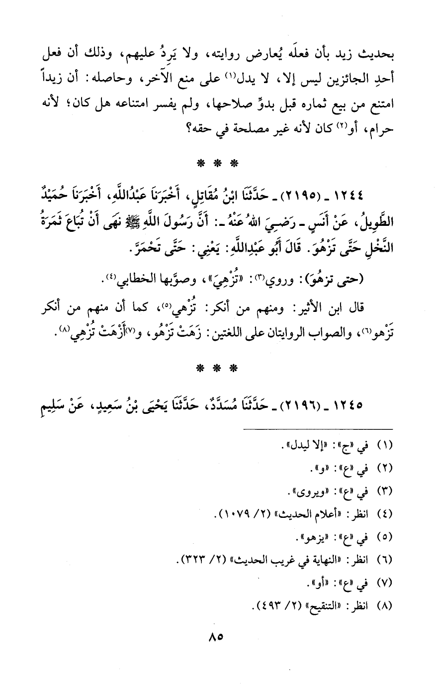 1244 - (2195) - حَدَّثَنَا ابْنُ مُقَاتِلٍ، أَخْبَرَناَ عَبْدُ اللهِ، أَخْبَرَناَ حُمَيْدٌ الطَّوِيلُ، عَنْ أَنسٍ -رَضِيَ اللهُ عَنْهُ-: أَنَّ رَسُولَ اللهِ - صلى الله عليه وسلم - نَهَى أَنْ تُبَاعَ ثَمَرَةُ النَّخْلِ حَتَّى تَزْهُوَ. قَالَ أَبُو عَبْدِ اللهِ: يَعْنِي: حَتَّى تَحْمَرَّ.