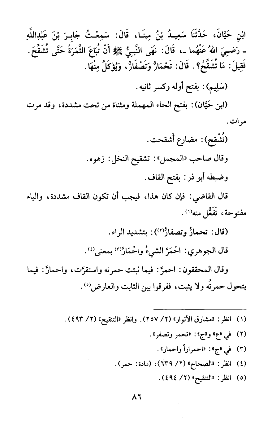 ابْنِ حَيَّانَ، حَدَّثَنَا سَعِيدُ بْنُ مِينَا، قَالَ: سَمِعْتُ جَابِرَ بْنَ عَبْدِ اللهِ -رَضِيَ اللهُ عَنْهُما-، قَالَ: نَهَى النَّبِيُّ - صلى الله عليه وسلم - أَنْ تُبَاعَ الثَّمَرَةُ حَتَّى تُشَقِّحَ. فَقِيلَ: مَا تُشَقِّحُ؟. قَالَ: تَحْمَارُّ وَتَصْفَارُّ، وَيُؤْكَلُ مِنْهَا.