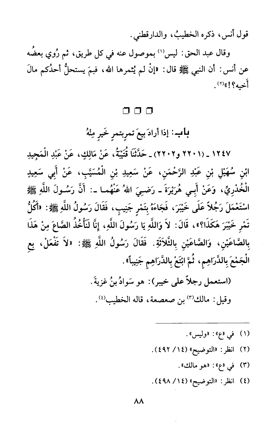 1247 - (2201 و 2202) - حَدَّثَنَا قُتَيْبَةُ، عَنْ مَالِكٍ، عَنْ عَبْدِ الْمَجِيدِ ابْنِ سُهَيْلِ بْنِ عَبْدِ الرَّحْمَنِ، عَنْ سَعِيدِ بْنِ الْمُسَيَّبِ، عَنْ أَبِي سَعِيدٍ الْخُدْرِيِّ، وَعَنْ أِبي هُرَيْرَةَ -رَضِيَ اللهُ عَنْهُما-: أَنَّ رَسُولَ اللهِ - صلى الله عليه وسلم - اسْتَعْمَلَ رَجُلاً عَلَى خَيْبَرَ، فَجَاءَهُ بِتَمْرٍ جَنِيبٍ، فَقَالَ رَسُولُ اللهِ - صلى الله عليه وسلم -: "أَكُلُّ تَمْرِ خَيْبَرَ هَكَذَا؟ "، قَالَ: لاَ وَاللهِ يَا رَسُولَ اللهِ، إِنَّا لَنَأْخُذُ الصَّاعَ مِنْ هَذَا بِالصَّاعَيْنِ، وَالصَّاعَيْنِ بِالثَّلاَثَةِ. فَقَالَ رَسُولُ اللهِ - صلى الله عليه وسلم -: "لاَ تَفْعَلْ، بِعِ الْجَمْعَ بِالدَّرَاهِمِ، ثُمَّ ابْتَعْ بِالدَّرَاهِم جَنِيباً".