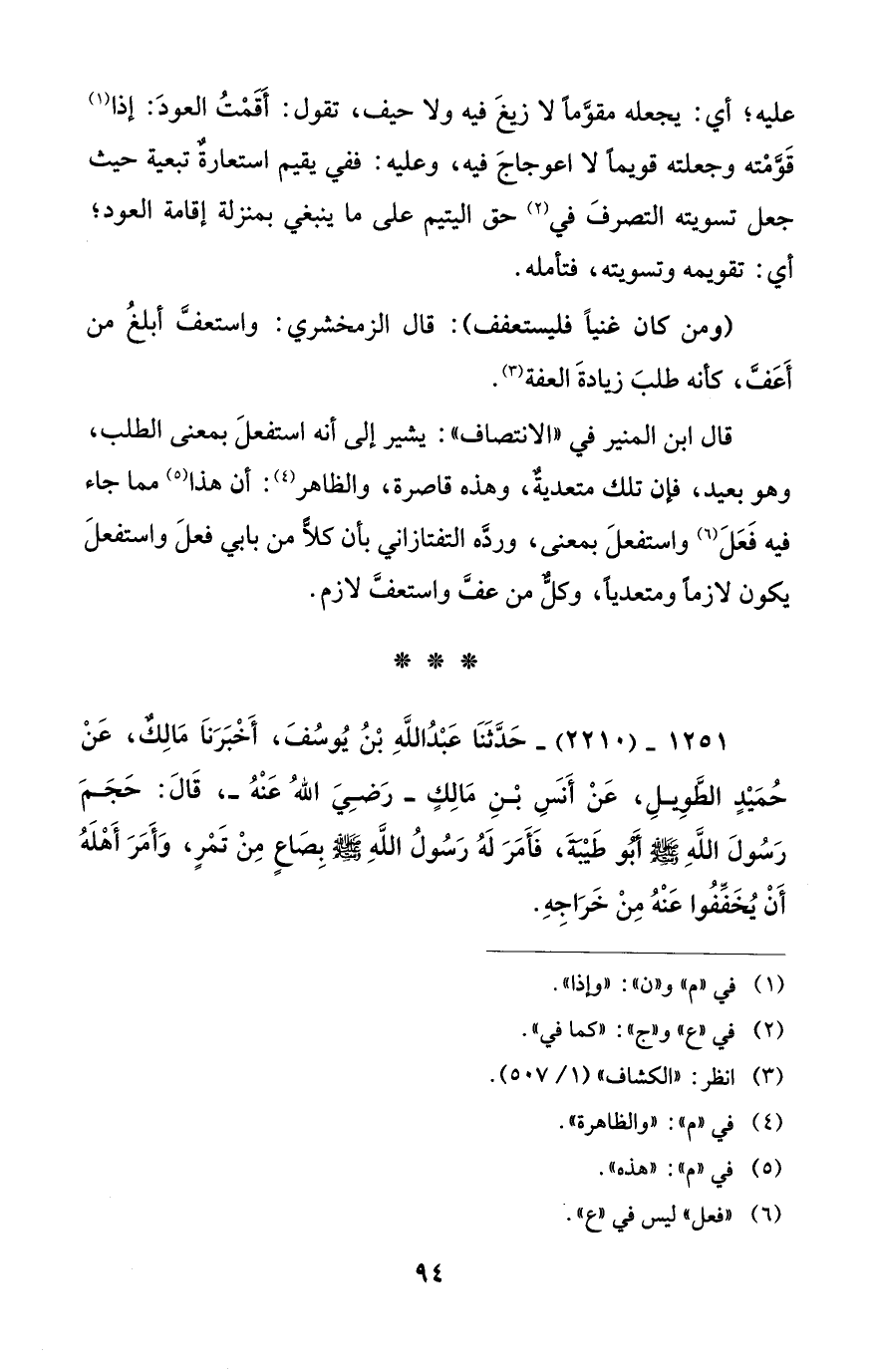 1251 - (2210) - حَدَّثَنَا عَبْدُ اللهِ بْنُ يُوسُفَ، أَخْبَرَناَ مَالِكٌ، عَنْ حُمَيْدٍ الطَوِيلِ، عَنْ أَنَسِ بْنِ مَالِكٍ -رَضِيَ اللهُ عَنْهُ-، قَالَ: حَجَمَ رَسُولَ اللهِ - صلى الله عليه وسلم - أَبُو طَيْبَةَ، فَأَمَرَ لَهُ رَسُولُ اللهِ - صلى الله عليه وسلم - بِصَاعٍ مِنْ تَمْرٍ، وَأَمَرَ أَهْلَهُ أَنْ يُخَفِّفُوا عَنْهُ مِنْ خَرَاجِهِ.