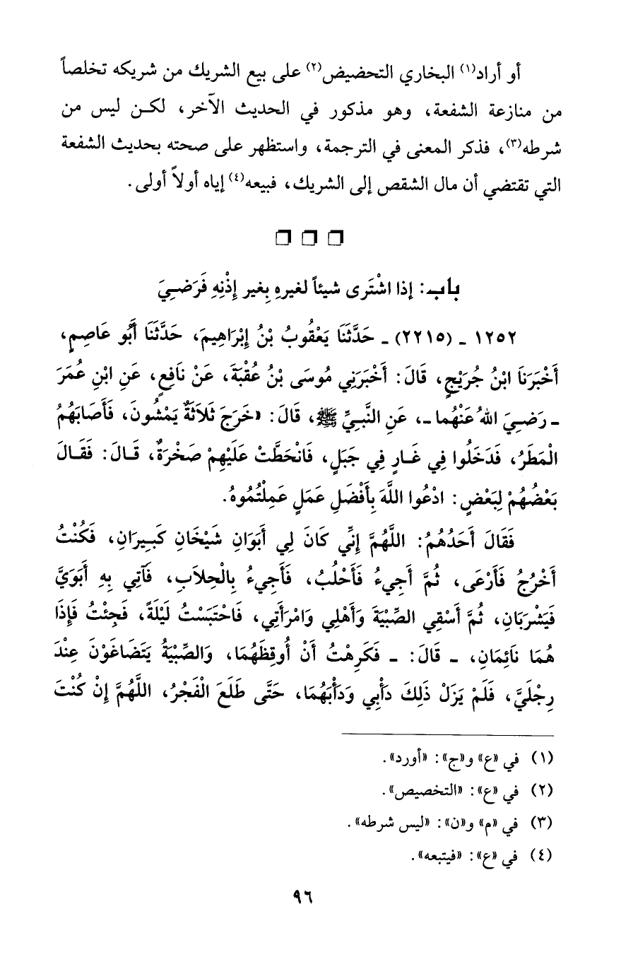1252 - (2215) - حَدَّثَنَا يَعْقُوبُ بْنُ إِبْرَاهِيمَ، حَدَّثَنَا أَبُو عَاصِمٍ، أَخْبَرَناَ ابْنُ جُرَيْجٍ، قَالَ: أَخْبَرَنِي مُوسَى بْنُ عُقْبَهَ، عَنْ ناَفِع، عَنِ ابْنِ عُمَرَ -رَضِيَ اللهُ عَنْهُما-، عَنِ النَّبِيِّ - صلى الله عليه وسلم -، قَالَ: "خَرَجَ ثَلاَثةٌ يَمْشُونَ، فَأَصَابَهُمُ الْمَطَرُ، فَدَخَلُوا فِي غَارٍ فِي جَبَلٍ، فَانْحَطَّتْ عَلَيْهِمْ صَخْرَةٌ، قَالَ: فَقَالَ بَعْضُهُمْ لِبَعْضٍ: ادْعُوا اللهَ بِأَفْضَلِ عَمَلٍ عَمِلْتُمُوهُ.