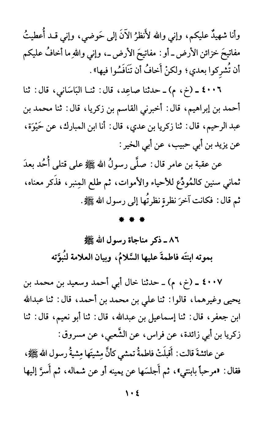 4006 - (خ، م) - حدثنا صاعد، قال: ثنا الباساني، قال: ثنا أحمد بن إبراهيم، قال: أخبرني القاسم بن زكريا، قال: ثنا محمد بن عبد الرحيم، قال: ثنا زكريا بن عدي، قال: أنا ابن المبارك، عن حيوة، عن يزيد بن أبي حبيب، عن أبي الخير: