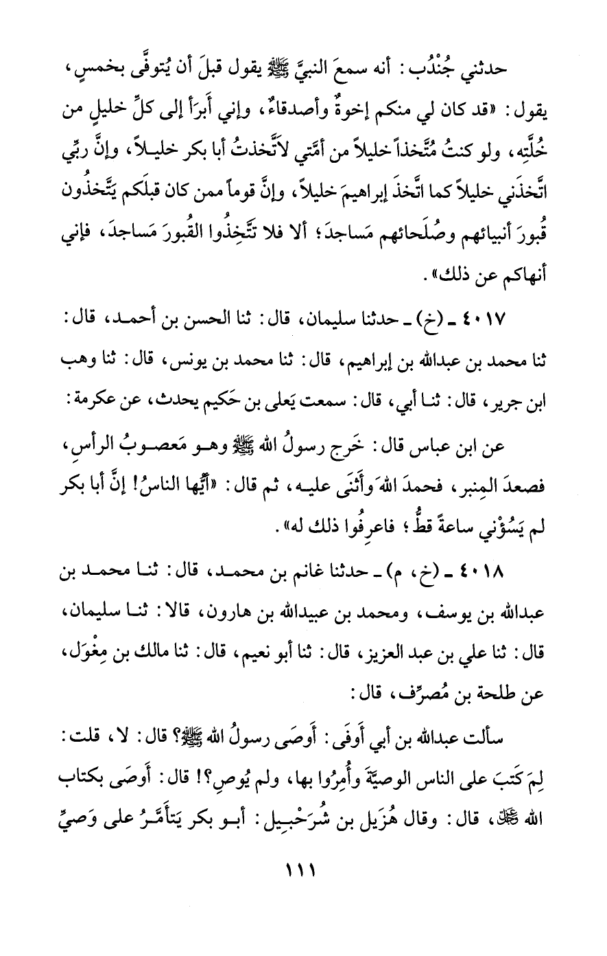 4018 - (خ، م) - حدثنا غانم بن محمد، قال: ثنا محمد بن عبد الله بن يوسف، ومحمد بن عبيد الله بن هارون، قالا: ثنا سليمان، قال: ثنا علي بن عبد العزيز، قال: ثنا أبو نعيم، قال: ثنا مالك بن مغول، عن طلحة بن مصرف، قال: