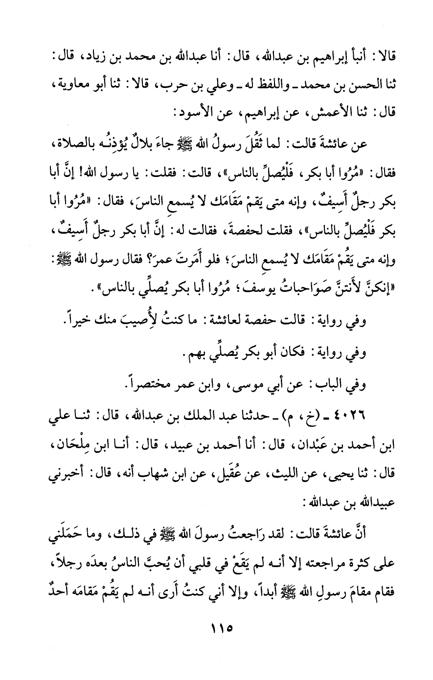 أن عائشة قالت: لقد راجعت رسول الله صلى الله عليه وسلم في ذلك، وما حملني على كثرة مراجعته إلا أنه لم يقع في قلبي أن يحب الناس بعده رجلا، فقام مقام رسول الله صلى الله عليه وسلم أبدا، وإلا أني كنت أرى أنه لم يقم مقامه أحد #116# إلا تشاءم الناس به، فأردت أن يعدل ذلك رسول الله صلى الله عليه وسلم عن أبي بكر.