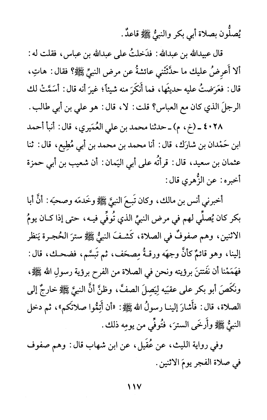 أخبرني أنس بن مالك، وكان تبع النبي صلى الله عليه وسلم وخدمه وصحبه: أن أبا بكر كان يصلي لهم في مرض النبي الذي توفي فيه، حتى إذا كان يوم الاثنين، وهم صفوف في الصلاة، كشف النبي صلى الله عليه وسلم ستر الحجرة ينظر إلينا، وهو قائم كأن وجهه ورقة مصحف، ثم تبسم، فضحك، قال: فهممنا أن نفتتن برؤيته ونحن في الصلاة من الفرح برؤية رسول الله صلى الله عليه وسلم، ونكص أبو بكر على عقبيه ليصل الصف، وظن أن النبي صلى الله عليه وسلم خارج إلى الصلاة، قال: فأشار إلينا رسول الله صلى الله عليه وسلم: ((أن أتموا صلاتكم))، ثم دخل النبي صلى الله عليه وسلم وأرخى الستر، فتوفي من يومه ذلك.