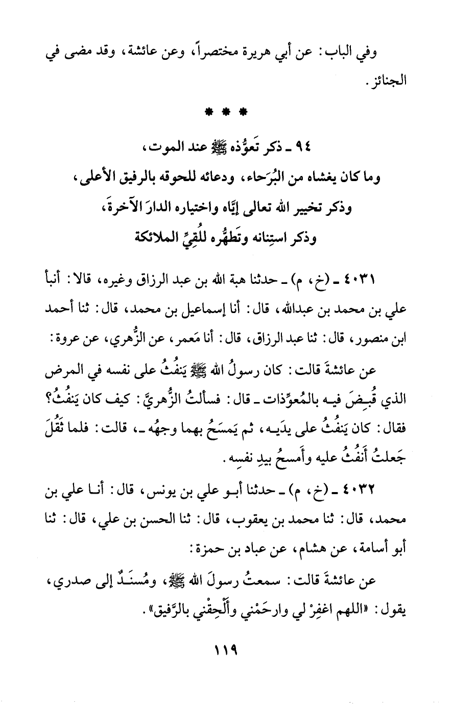 [94] ذكر تعوذه صلى الله عليه وسلم عند الموت، وما كان يغشاه من البرحاء، ودعائه للحوقه بالرفيق الأعلى، وذكر تخيير الله تعالى إياه واختياره الدار الآخرة، وذكر استنانه وتطهره للقي الملائكة