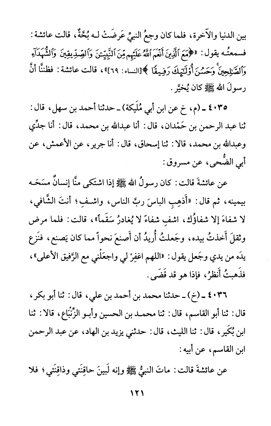 عن عائشة قالت: كان رسول الله صلى الله عليه وسلم إذا اشتكى منا إنسان مسحه بيمينه، ثم قال: ((أذهب الباس رب الناس، واشف؛ أنت الشافي، لا شفاء إلا شفاؤك، اشف شفاء لا يغادر سقما))، قالت: فلما مرض وثقل أخذت بيده، وجعلت أريد أن أصنع نحوا مما كان يصنع، فنزع يده من يدي وجعل يقول: ((اللهم اغفر لي واجعلني مع الرفيق الأعلى))، فذهبت أنظر، فإذا هو قد قضى.