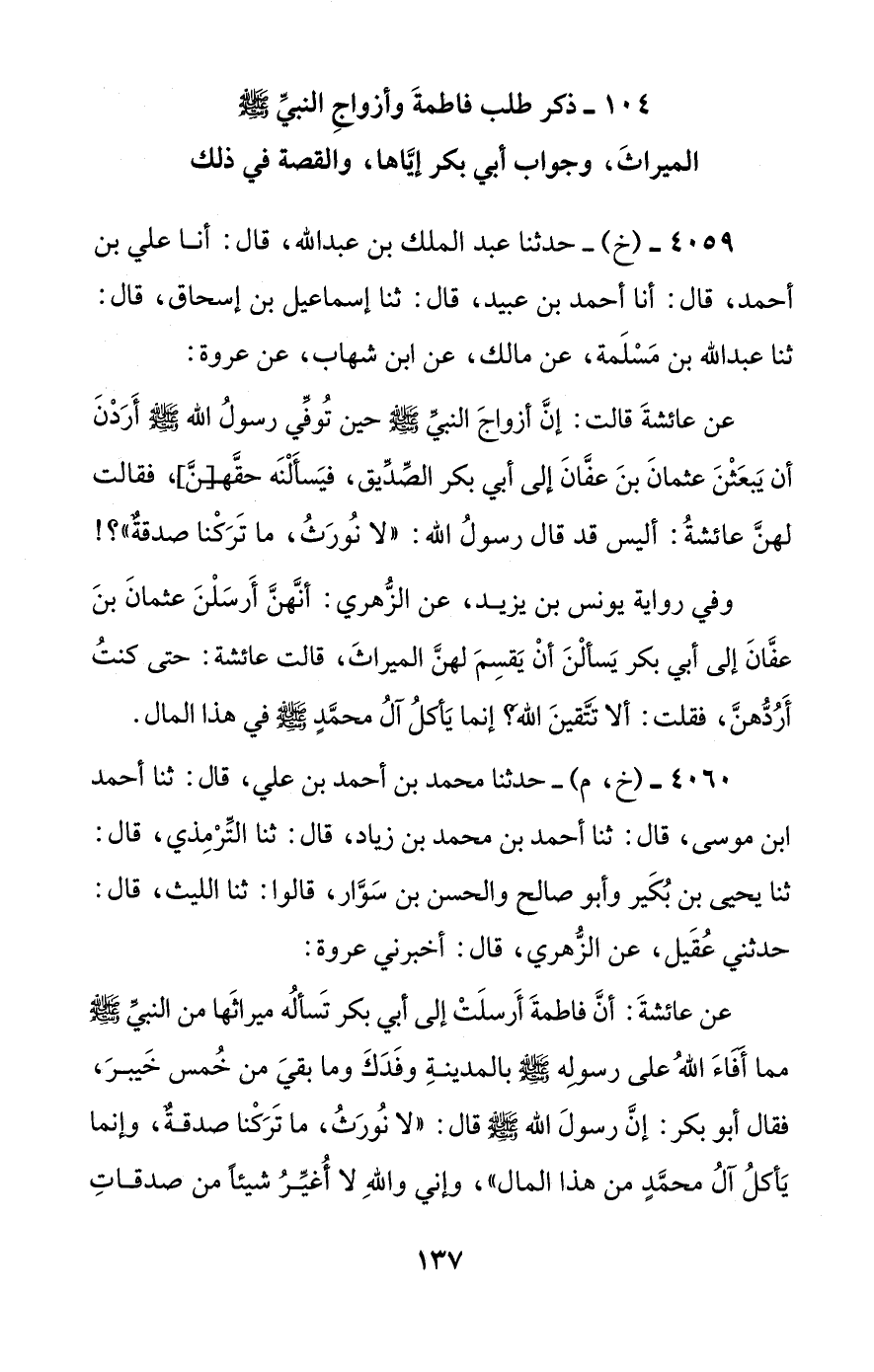 عن عائشة قالت: إن أزواج النبي صلى الله عليه وسلم حين توفي رسول الله صلى الله عليه وسلم أردن أن يبعثن عثمان بن عفان إلى أبي بكر الصديق، فيسألنه حقهـ[ن]، فقالت لهن عائشة: أليس قد قال رسول الله: ((لا نورث، ما تركنا صدقة))؟!