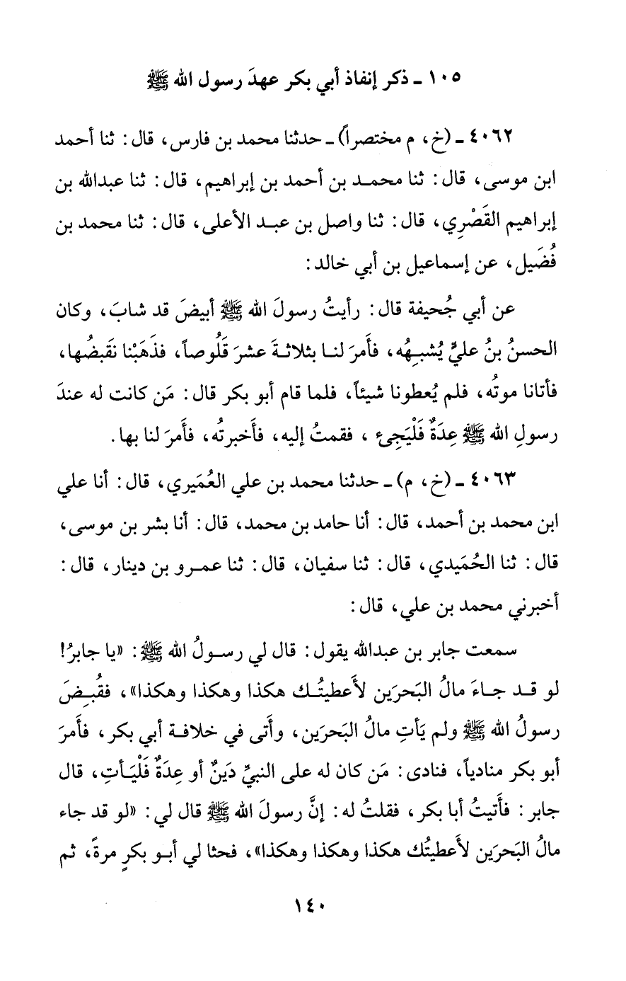 4062 - (خ، م مختصرا) - حدثنا محمد بن فارس، قال: ثنا أحمد بن موسى، قال: ثنا محمد بن أحمد بن إبراهيم، قال: ثنا عبد الله بن إبراهيم القصري، قال: ثنا واصل بن عبد الأعلى، قال: ثنا محمد بن فضيل، عن إسماعيل بن أبي خالد: