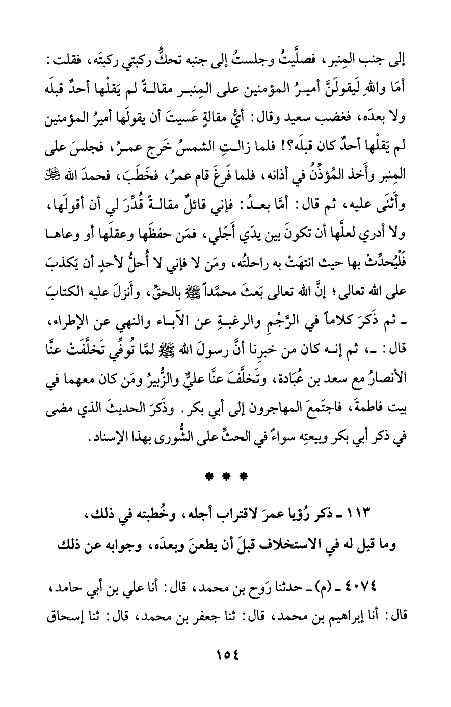 [113] ذكر رؤيا عمر لاقتراب أجله، وخطبته في ذلك، وما قيل له في الاستخلاف قبل أن يطعن وبعده، وجوابه عن ذلك