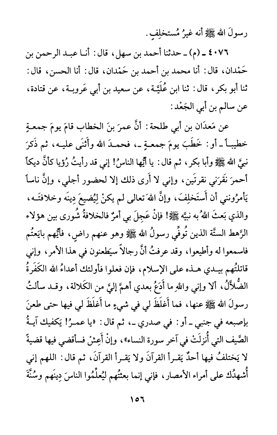 عن معدان بن أبي طلحة: أن عمر بن الخطاب قام يوم جمعة خطيبا –أو: خطب يوم جمعة-، فحمد الله وأثنى عليه، ثم ذكر نبي الله صلى الله عليه وسلم وأبا بكر، ثم قال: يا أيها الناس! إني قد رأيت رؤيا كأن ديكا أحمر نقرني نقرتين، وإني لا أرى ذلك إلا لحضور أجلي، وإن ناسا يأمرونني أن أستخلف، وإن الله تعالى لم يكن ليضيع دينه وخلافته، والذي بعث الله به نبيه صلى الله عليه وسلم! فإن عجل بي أمر فالخلافة شورى بين هؤلاء الرهط الستة الذين توفي رسول الله صلى الله عليه وسلم وهو عنهم راض، فأيهم بايعتم فاسمعوا له وأطيعوا، وقد عرفت أن رجالا سيطعنون في هذا الأمر، وإني قاتلتهم بيدي هذه على الإسلام، فإن فعلوا فأولئك أعداء الله الكفرة الضلال، ألا وإني والله ما أدع بعدي أهم إلي من الكلالة، وقد سألت رسول الله صلى الله عليه وسلم عنها، فما أغلظ لي في شيء ما أغلظ لي فيها حتى طعن بإصبعه في جنبي –أو: في صدري-، ثم قال: ((يا عمر! يكفيك آية الصيف التي أنزلت في آخر سورة النساء))، وإن أعش فسأقضي فيها قضية لا يختلف فيها أحد يقرأ القرآن ولا يقرأ القرآن، ثم قال: اللهم إني أشهدك على أمراء الأمصار، فإني إنما بعثتهم ليعلموا الناس دينهم وسنة #157# نبيهم، ويقسموا فيئهم، ويعدلوا فيهم، ومن أشكل عليه شيء رفعه إلي، ثم قال: يا أيها الناس! إنكم تأكلون شجرتين ما أراهما إلا خبيثتين؛ هذا الثوم وهذا البصل، لقد كنت أرى الرجل على عهد رسول الله صلى الله عليه وسلم يوجد منه ريحه، فيؤخذ بيده حتى يخرج به إلى البقيع، فمن أكلهما لا بد فليمتهما طبخا.
