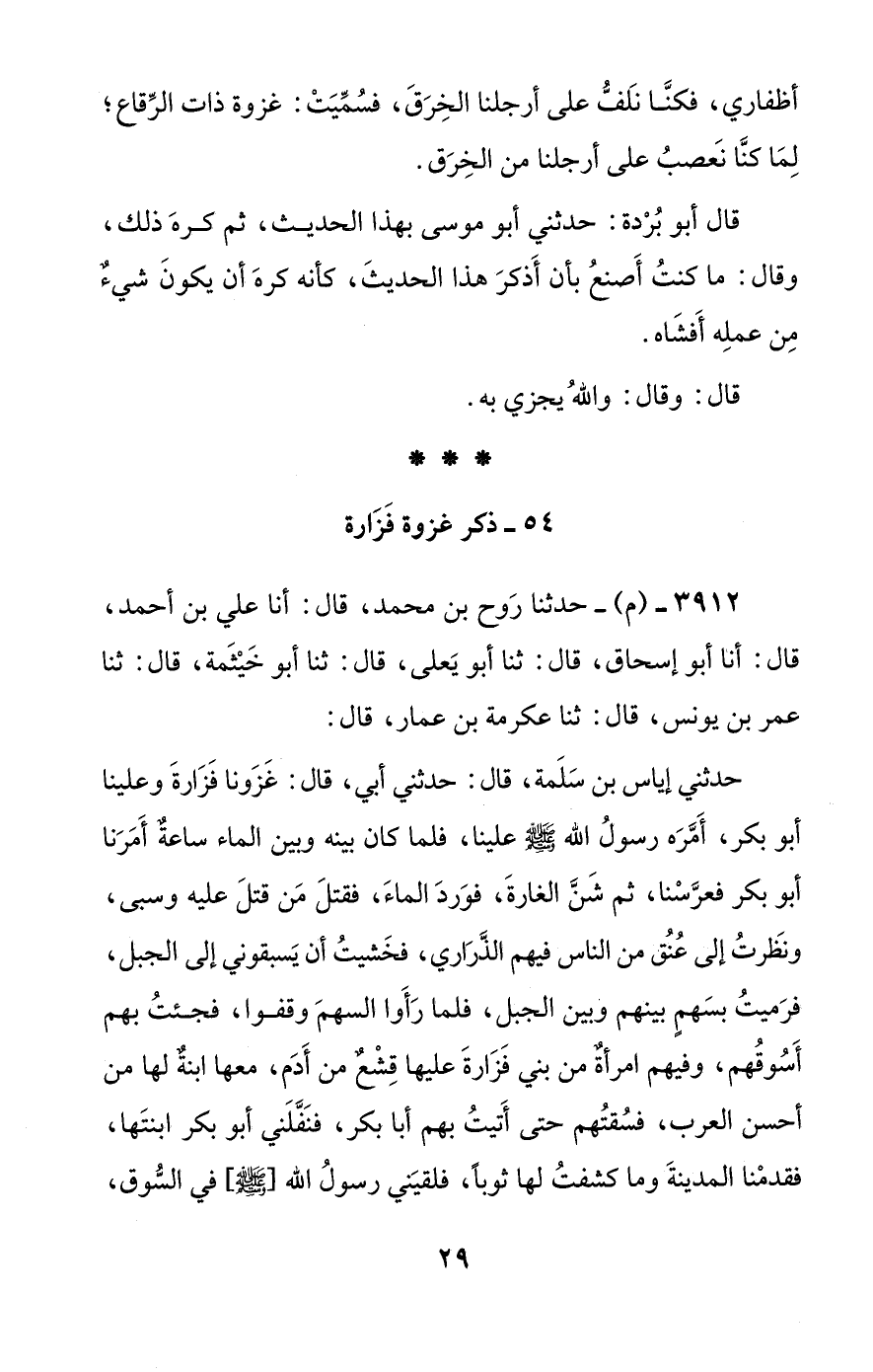حدثني إياس بن سلمة، قال: حدثني أبي، قال: غزونا فزارة وعلينا أبو بكر، أمره رسول الله صلى الله عليه وسلم علينا، فلما كان بينه وبين الماء ساعة أمرنا أبو بكر فعرسنا، ثم شن الغارة، فورد الماء، فقتل من قتل عليه وسبى، ونظرت إلى عنق من الناس فيهم الذراري، فخشيت أن يسبقوني إلى الجبل، فرميت بسهم بينهم وبين الجبل، فلما رأوا السهم وقفوا، فجئت بهم أسوقهم، وفيهم امرأة من بني فزارة عليها قشع من أدم، معها ابنة لها من أحسن العرب، فسقتهم حتى أتيت بهم أبا بكر، فنفلني أبو بكر ابنتها، فقدمنا المدينة وما كشفت لها ثوبا، فلقيني رسول الله [صلى الله عليه وسلم] في السوق، #30# فقال: ((يا سلمة! هب لي المرأة))، فقلت: يا رسول الله! والله لقد أعجبتني، وما كشفت لها ثوبا، ثم لقيني رسول الله [صلى الله عليه وسلم] من الغد في السوق، فقال: ((يا سلمة! هب لي المرأة لله أبوك))، فقلت: هي لك يا رسول الله، فوالله ما كشفت لها ثوبا، فبعث بها رسول الله [صلى الله عليه وسلم] إلى أهل مكة، ففدى بها ناسا من المسلمين كانوا أسارى بمكة.