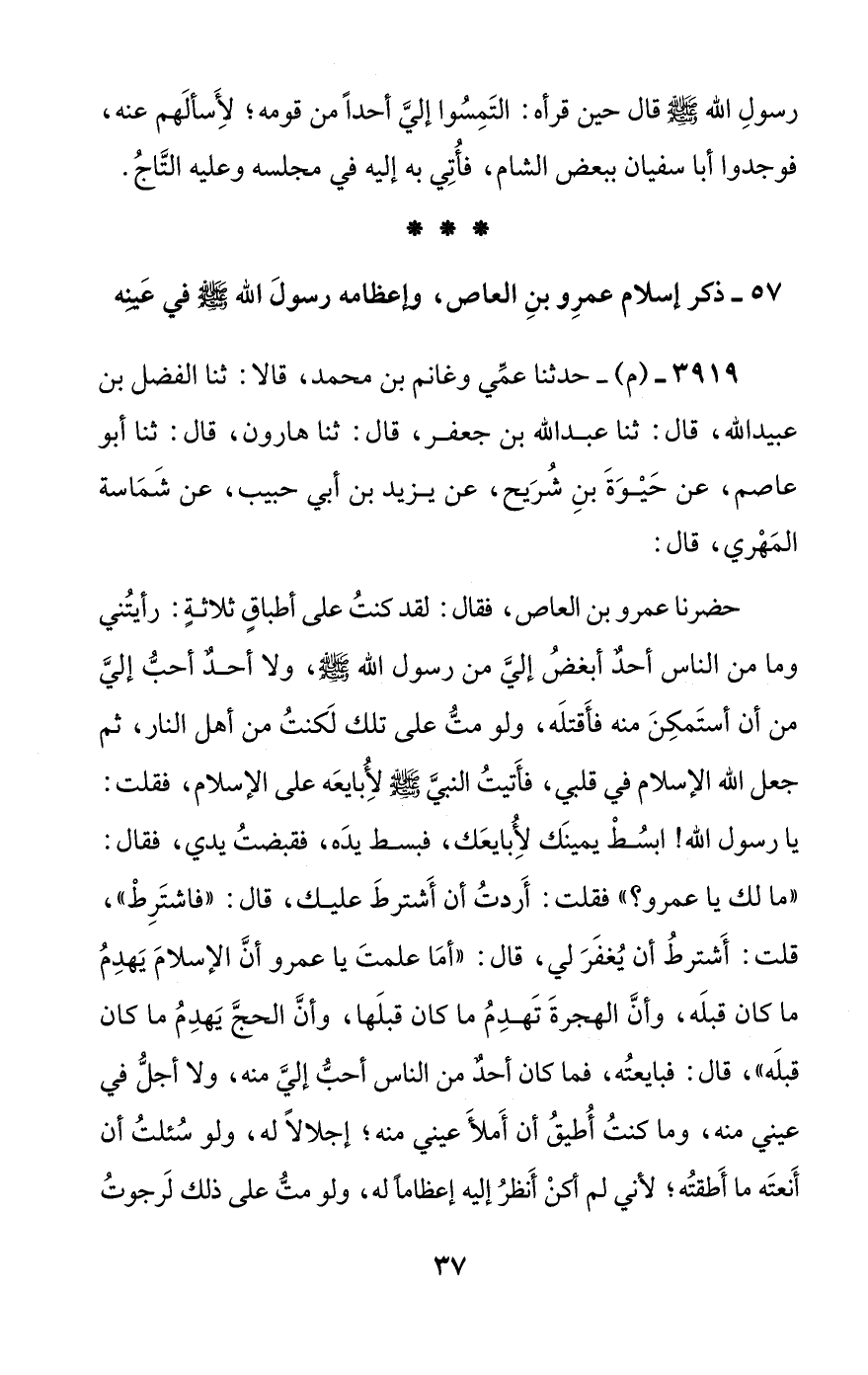 [57] ذكر إسلام عمرو بن العاص، وإعظامه رسول الله صلى الله عليه وسلم في عينه