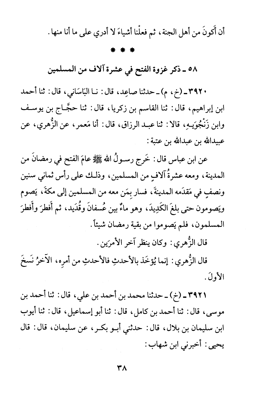 3920 - (خ، م) - حدثنا صاعد، قال: نا الباساني، قال: ثنا أحمد ابن إبراهيم، قال: ثنا القاسم بن زكريا، قال: ثنا حجاج بن يوسف وابن زنجويه، قالا: ثنا عبد الرزاق، قال: أنا معمر، عن الزهري، عن عبيد الله بن عبد الله بن عتبة: