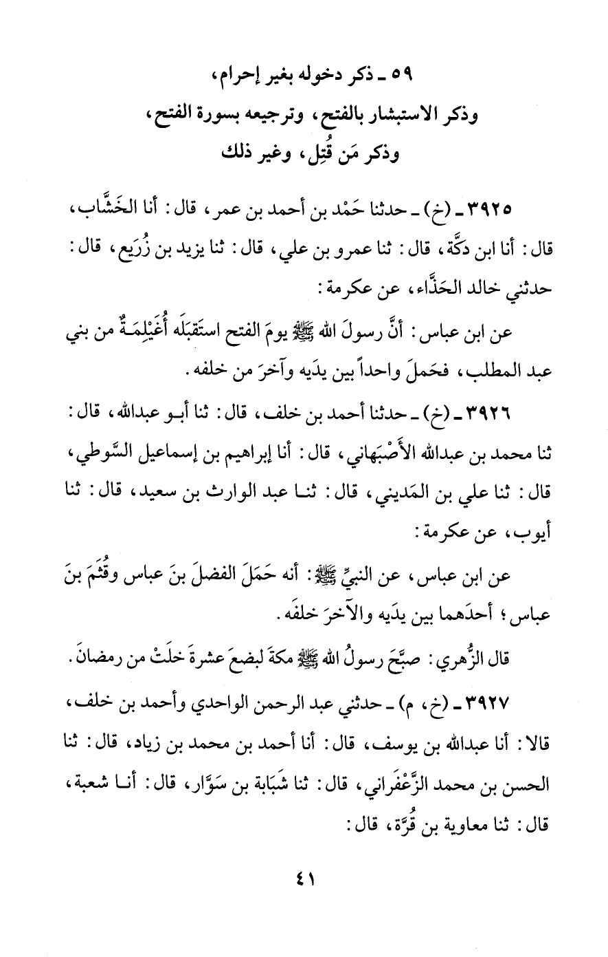 [59] ذكر دخوله بغير إحرام، وذكر الاستبشار بالفتح، وترجيعه بسورة الفتح، وذكر من قتل، وغير ذلك