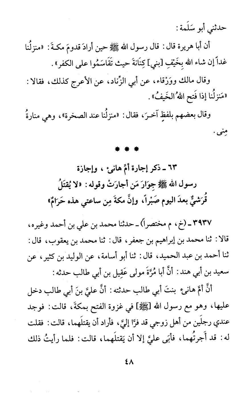 [63] ذكر إجارة أم هانئ، وإجازة رسول الله صلى الله عليه وسلم جوار من أجارت وقوله: ((لا يقتل قرشي بعد اليوم صبرا، وإن مكة من ساعتي هذه حرام))