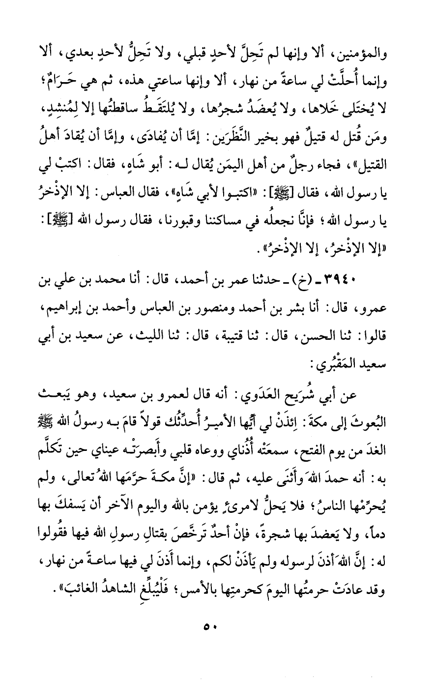 عن أبي شريح العدوي: أنه قال لعمرو بن سعيد، وهو يبعث البعوث إلى مكة: ائذن لي أيها الأمير أحدثك قولا قام به رسول الله صلى الله عليه وسلم الغد من يوم الفتح، سمعته أذناي ووعاه قلبي وأبصرته عيناي حين تكلم به: أنه حمد الله وأثنى عليه، ثم قال: ((إن مكة حرمها الله تعالى، ولم يحرمها الناس؛ فلا يحل لامرئ يؤمن بالله واليوم الآخر أن يسفك بها دما، ولا يعضد بها شجرة، فإن أحد ترخص بقتال رسول الله فيها فقولوا له: إن الله أذن لرسوله ولم يأذن لكم، وإنما أذن لي فيها ساعة من نهار، وقد عادت حرمتها اليوم كحرمتها بالأمس؛ فليبلغ الشاهد الغائب)).