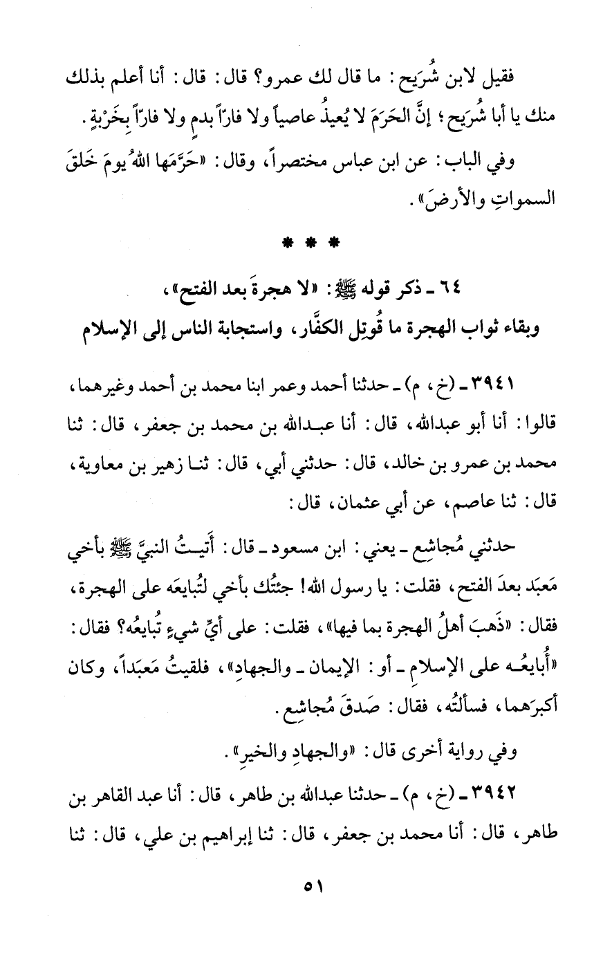 [64] ذكر قوله صلى الله عليه وسلم ((لا هجرة بعد الفتح))، وبقاء ثواب الهجرة ما قوتل الكفار، واستجابة الناس إلى الإسلام