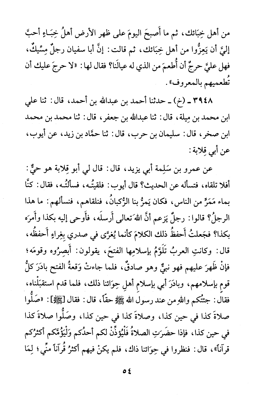 3948 - (خ) - حدثنا أحمد بن عبد الله بن أحمد، قال: ثنا علي بن محمد بن ميلة، قال: ثنا عبد الله بن جعفر، قال: ثنا محمد بن محمد بن صخر، قال: سليمان بن حرب، قال: ثنا حماد بن زيد، عن أيوب، عن أبي قلابة: