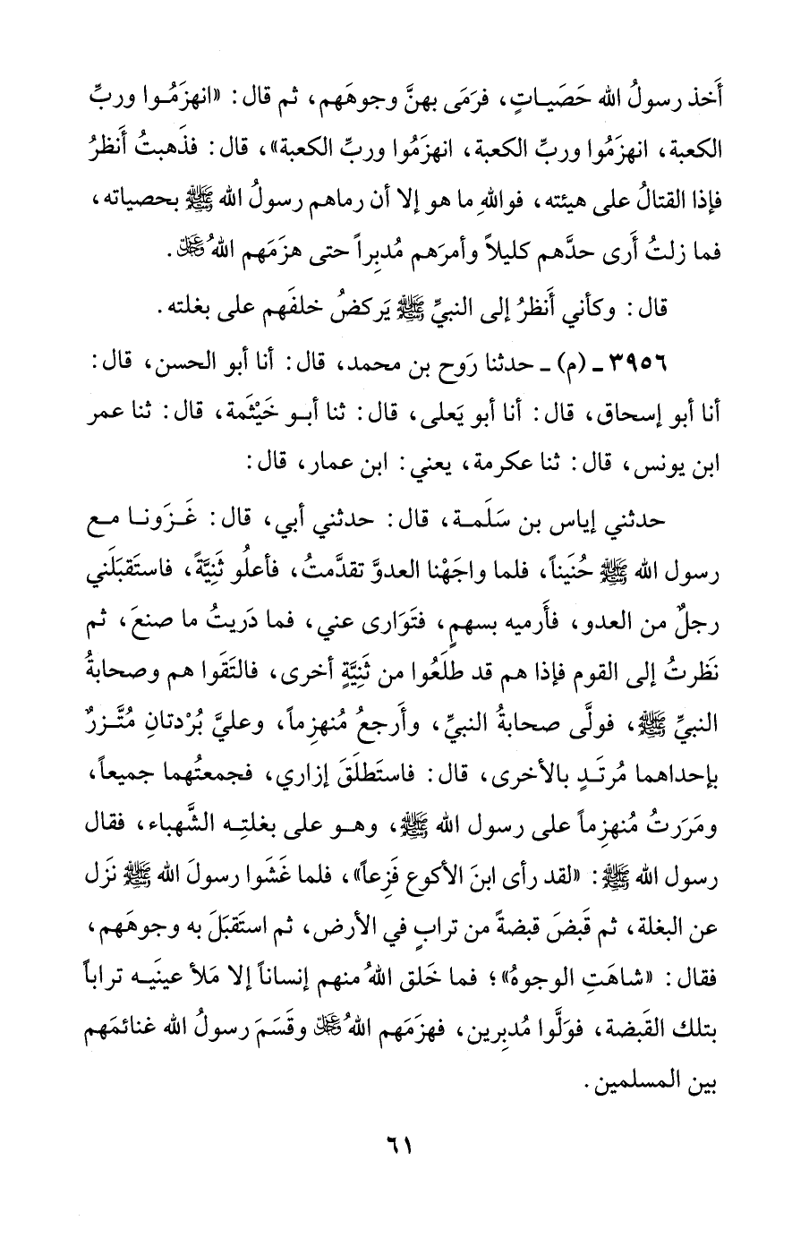 حدثني إياس بن سلمة، قال: حدثني أبي، قال: غزونا مع رسول الله صلى الله عليه وسلم حنينا، فلما واجهنا العدو تقدمت، فأعلوا ثنية، فاستقبلني رجل من العدو، فأرميه بسهم، فتوارى عني، فما دريت ما صنع، ثم نظرت إلى القوم فإذا هم قد طلعوا من ثنية أخرى، فالتقوا هم وصحابة النبي صلى الله عليه وسلم، فولى صحابة النبي، وأرجع منهزما، وعلي بردتان متزر بإحداهما مرتد بالأخرى، قال: فاستطلق إزاري، فجمعتهما جميعا، ومررت منهزما على رسول الله صلى الله عليه وسلم، وهو على بغلته الشهباء، فقال رسول الله صلى الله عليه وسلم: ((لقد رأى ابن الأكوع فزعا))، فلما غشوا رسول الله صلى الله عليه وسلم نزل عن البغلة، ثم قبض قبضة من تراب في الأرض، ثم استقبل به وجوههم، فقال: ((شاهت الوجوه))؛ فما خلق الله منهم إنسانا إلا ملأ عينيه ترابا بتلك القبضة، فولوا مدبرين، فهزمهم الله عز وجل وقسم رسول الله غنائمهم بين المسلمين.