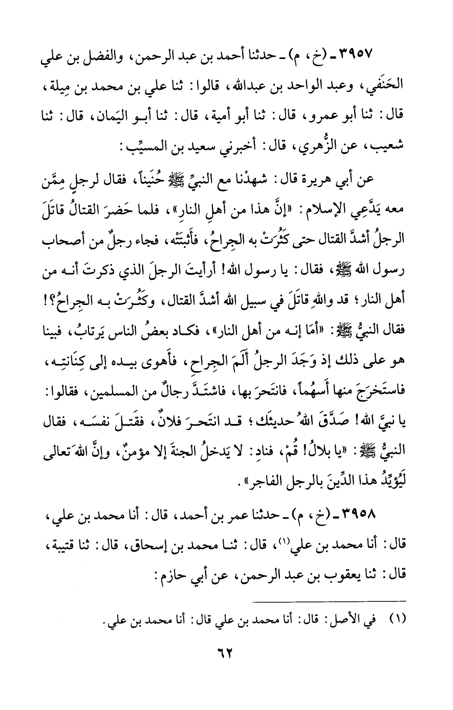3958 - (خ، م) - حدثنا عمر بن أحمد، قال: أنا محمد بن علي، قال: أنا محمد بن علي، قال: ثنا محمد بن إسحاق، قال: ثنا قتيبة، قال: ثنا يعقوب بن عبد الرحمن، عن أبي حازم: #63# عن سهل بن سعد: أن رسول الله صلى الله عليه وسلم التقى هو والمشركون، فاقتتلوا، فلما مال رسول الله صلى الله عليه وسلم إلى عسكره، ومال الآخرون إلى عسكرهم، وفي أصحاب رسول الله صلى الله عليه وسلم رجل لا يدع لهم شاذة ولا فاذة إلا اتبعها يضربها بسيفه، فقالوا: ما أجزأ منا اليوم أحد كما أجزأ فلان، فقال رسول الله صلى الله عليه وسلم: ((أما إنه من أهل النار))، فقال رجل من القوم: أنا صاحبه أبدا، فخرج معه، كلما وقف وقف معه، وإذا أسرع أسرع معه، قال: فجرح الرجل جرحا شديدا، فاستعجل الموت، فوضع نصل سيفه بالأرض وذبابته بين ثدييه، ثم تحامل على سيفه، فقتل نفسه، فخرج الرجل إلى رسول الله صلى الله عليه وسلم، فقال: أشهد أنك رسول الله، قالوا: وما ذاك؟ قال الرجل: الذي ذكرت آنفا أنه من أهل النار، فأعظم الناس ذلك، فقلت: أنا لكم به، فخرجت في طلبه حتى جرح جرحا شديدا، فاستعجل الموت، فوضع نصل سيفه في الأرض وذبابته بين ثدييه، ثم تحامل عليه، فقتل نفسه، فقال رسول الله صلى الله عليه وسلم عند ذلك: ((إن الرجل ليعمل عمل أهل الجنة –فيما يبدو للناس- وهو من أهل النار، وإن الرجل ليعمل عمل أهل النار –فيما يبدو للناس- وهو من أهل الجنة)).