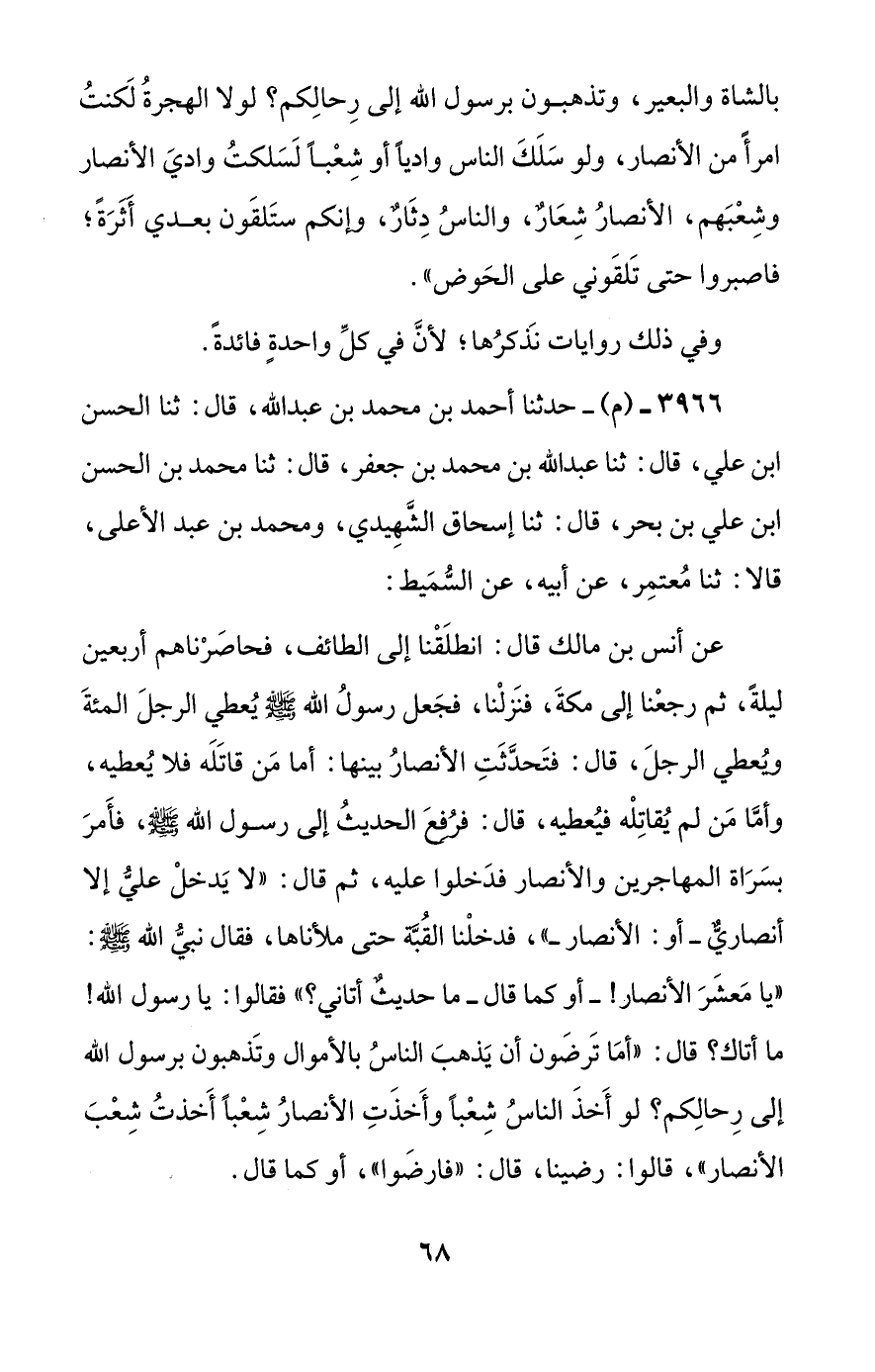 عن أنس بن مالك قال: انطلقنا إلى الطائف، فحاصرناهم أربعين ليلة، ثم رجعنا إلى مكة، فنزلنا، فجعل رسول الله صلى الله عليه وسلم يعطي الرجل المئة ويعطي الرجل، قال: فتحدثت الأنصار بينها: أما من قاتله فلا يعطيه، وأما من لم يقاتله فيعطيه، قال: فرفع الحديث إلى رسول الله صلى الله عليه وسلم، فأمر بسراة المهاجرين والأنصار فدخلوا عليه، ثم قال: ((لا يدخل علي إلا أنصاري –أو: الأنصار-))، فدخلنا القبة حتى ملأناها، فقال نبي الله صلى الله عليه وسلم: ((يا معشر الأنصار! –أو كما قال- ما حديث أتاني؟)) فقالوا: يا رسول الله! ما أتاك؟ قال: ((أما ترضون أن يذهب الناس بالأموال وتذهبون برسول الله إلى رحالكم؟ لو أخذ الناس شعبا وأخذت الأنصار شعبا أخذت شعب الأنصار))، قالوا: رضينا، قال: ((فارضوا))، أو كما قال.