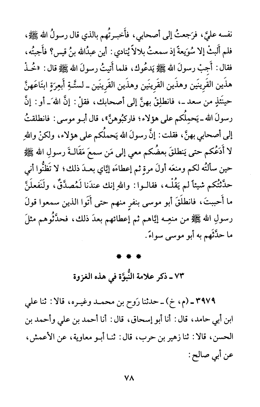 3979 - (م، خ) - حدثنا روح بن محمد وغيره، قالا: ثنا علي ابن أبي حامد، قال: أنا أبو إسحاق، قال: أنا أحمد بن علي وأحمد بن الحسن، قالا: ثنا زهير بن حرب، قال: ثنا أبو معاوية، عن الأعمش، عن أبي صالح: #79# عن أبي سعيد أو أبي هريرة –شك الأعمش-، قال: لما كانت غزاة تبوك أصابت الناس مجاعة، فقالوا: يا رسول الله! لو أذنت لنا فنحرنا نواضحنا، فأكلنا وادهنا؟ فقال لهم رسول الله صلى الله عليه وسلم: ((افعلوا))، فجاء عمر، فقال: يا رسول الله! إنهم إن فعلوا قل الظهر، ولكن ادعهم بفضل أزوادهم، ثم ادع الله لهم عليها بالبركة؛ لعل الله تعالى أن يجعل في ذلك خيرا، قال: فدعا رسول الله صلى الله عليه وسلم بنطع، فبسطه، ثم دعا بفضل أزوادهم، قال: فجعل الرجل يجيء بكف الذرة والآخر يجيء بكف التمر والآخر بالكسرة حتى اجتمع على النطع شيء من ذلك يسير، قال: ثم دعا عليه بالبركة، ثم قال لهم: ((خذوا في أوعيتكم))، قال: فأخذوا في أوعيتهم حتى ما تركوا في العسكر وعاء إلا ملؤوه، قال: وأكلوا حتى شبعوا، وفضلت منه فضلة، فقال رسول الله صلى الله عليه وسلم: ((أشهد أن لا إله إلا الله وأني رسول الله: لا يلقى الله بهما عبد غير شاك؛ فيحجب عن الجنة)).
