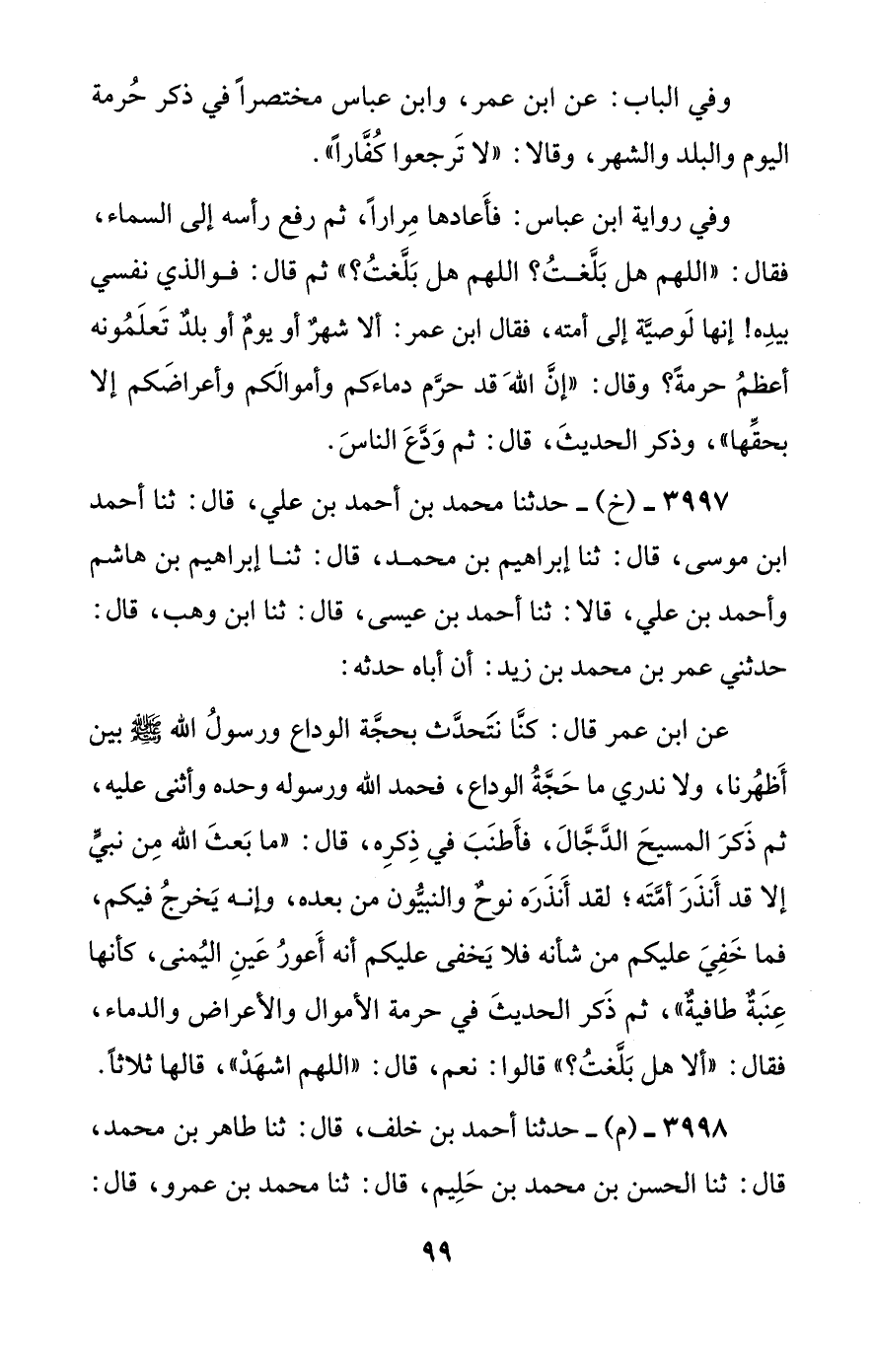 عن ابن عمر قال: كنا نتحدث بحجة الوداع ورسول الله صلى الله عليه وسلم بين أظهرنا، ولا ندري ما حجة الوداع، فحمد الله ورسوله وحده وأثنى عليه، ثم ذكر المسيح الدجال، فأطنب في ذكره، قال: ((ما بعث الله من نبي إلا قد أنذر أمته؛ لقد أنذره نوح والنبيون من بعده، وإنه يخرج فيكم، فما خفي عليكم من شأنه فلا يخفى عليكم أنه أعور عين اليمنى، كأنها عنبة طافية))، ثم ذكر الحديث في حرمة الأموال والأعراض والدماء، فقال: ((ألا هل بلغت؟)) قالوا: نعم، قال: ((اللهم اشهد))، قالها ثلاثا.