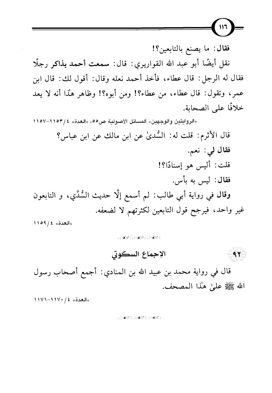 نقل أيضًا أبو عبد اللَّه القواريري: قال: سمعت أحمد يذاكر رجلًا فقال له الرجل: قال عطاء، فأخذ أحمد نعله وقال: أقول لك: قال ابن عمر، وتقول: قال عطاء، من عطاء؟ ! ومن أبوه؟ ! وظاهر هذا أنه لا يعد خلافًا على الصحابة.