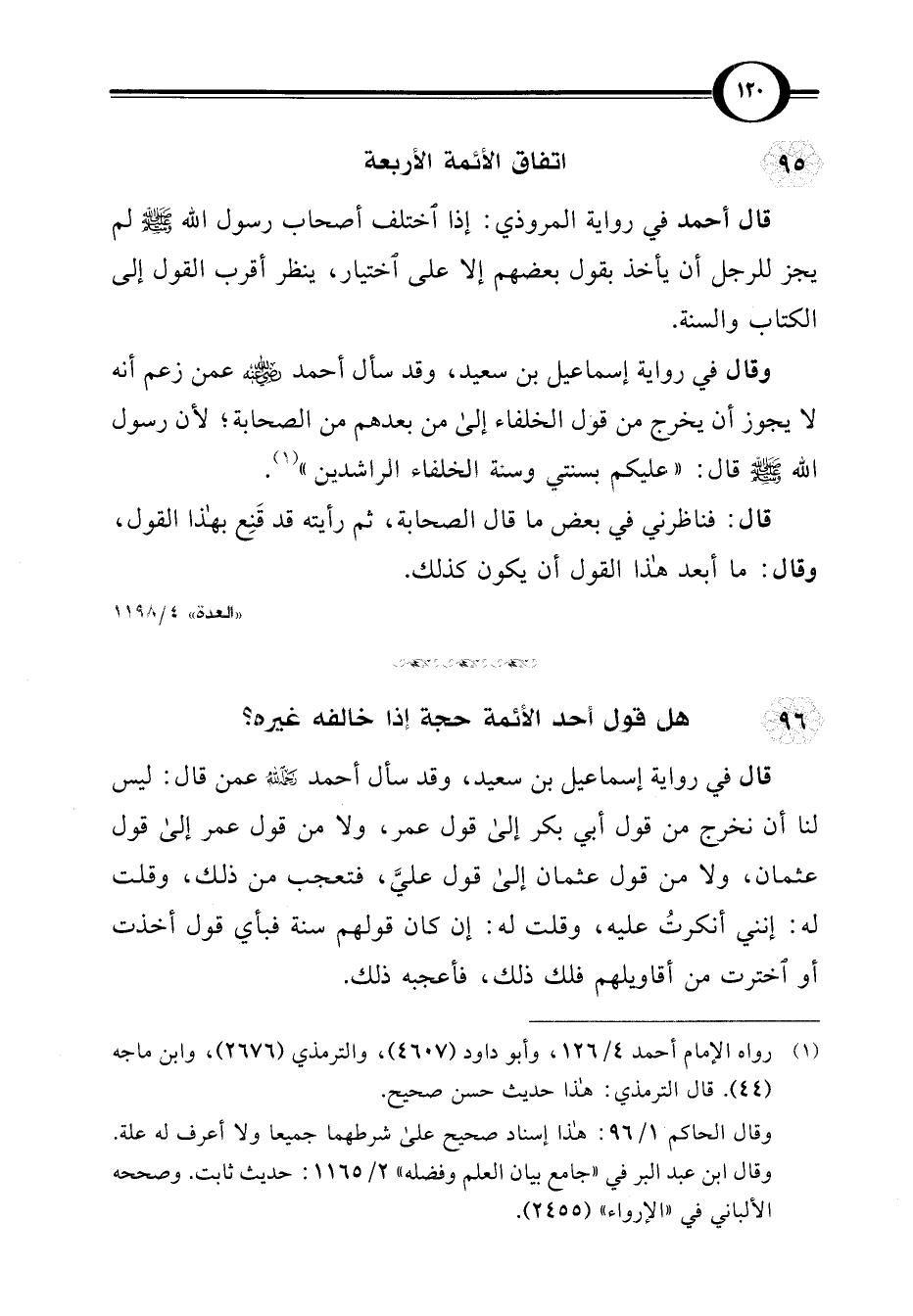 وقال في رواية إسماعيل بن سعيد، وقد سأل أحمد رضي اللَّه عنه عمن زعم أنه لا يجوز أن يخرج من قول الخلفاء إلى من بعدهم من الصحابة؛ لأن رسول اللَّه -صلى اللَّه عليه وسلم- قال: "عليكم بسنتي وسنة الخلفاء الراشدين" (¬1).