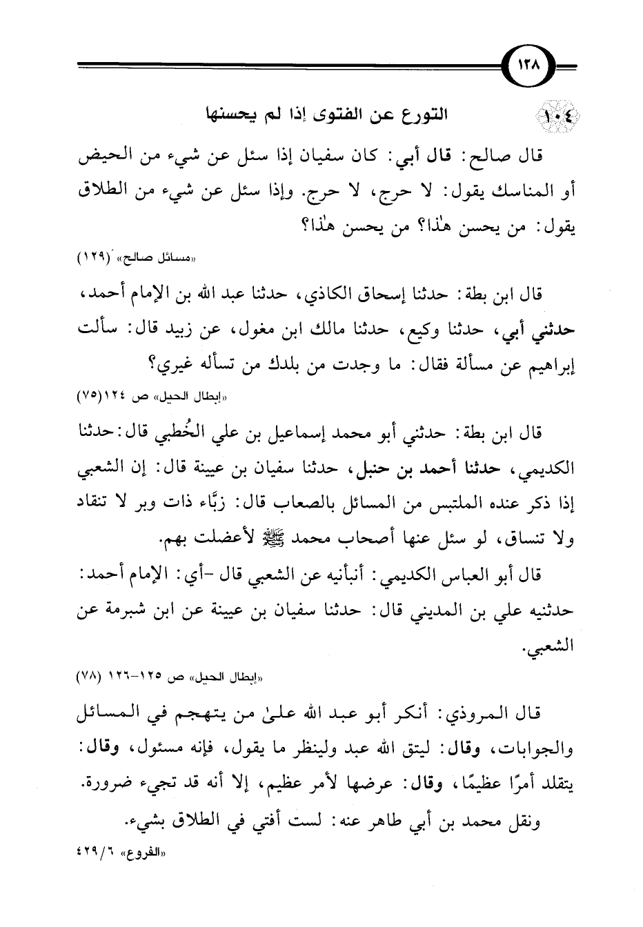 قال صالح: قال أبي: كان سفيان إذا سئل عن شيء من الحيض أو المناسك يقول: لا حرج، لا حرج. وإذا سئل عن شيء من الطلاق يقول: من يحسن هذا؟ من يحسن هذا؟