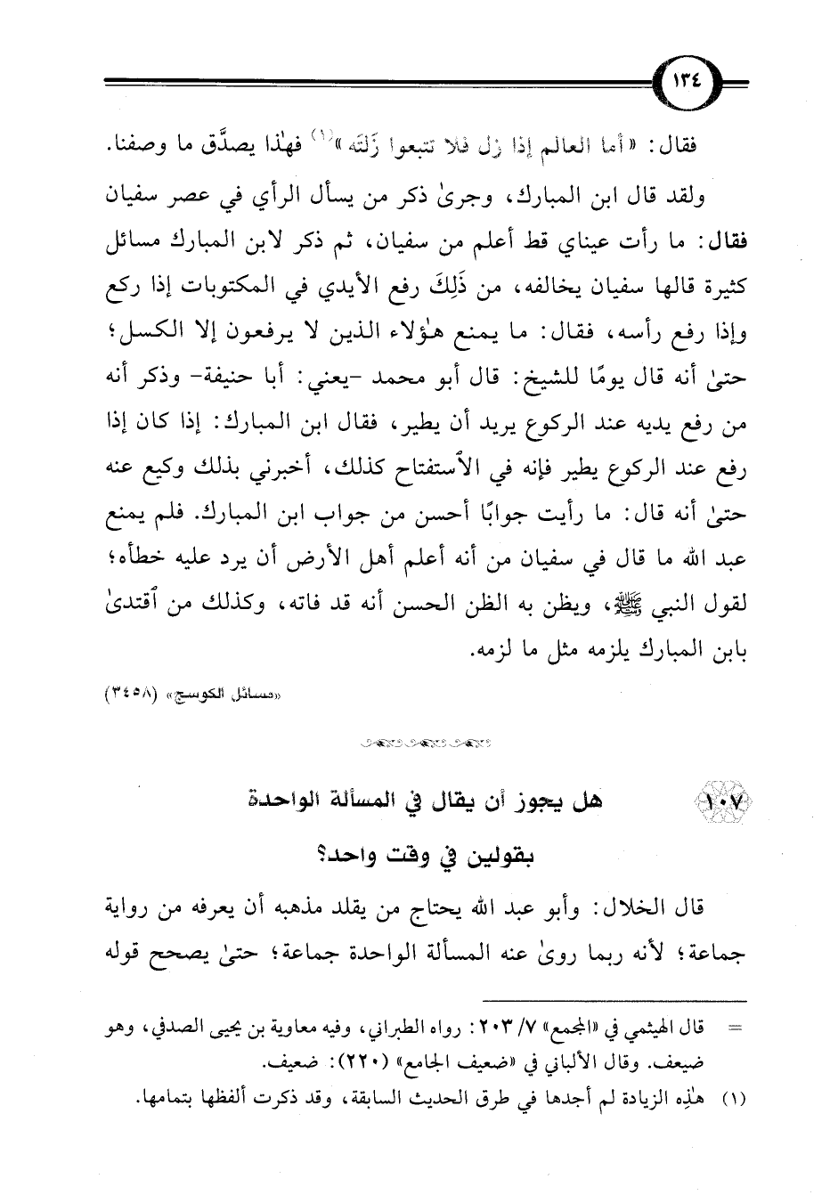 ولقد قال ابن المبارك، وجرى ذكر من يسأل الرأي في عصر سفيان فقال: ما رأت عيناي قط أعلم من سفيان، ثم ذكر لابن المبارك مسائل كثيرة قالها سفيان يخالفه، من ذَلِكَ رفع الأيدي في المكتوبات إذا ركع وإذا رفع رأسه، فقال: ما يمنع هؤلاء الذين لا يرفعون إلا الكسل؛ حتى أنه قال يومًا للشيخ: قال أبو محمد -يعني: أبا حنيفة- وذكر أنه من رفع يديه عند الركوع يريد أن يطير، فقال ابن المبارك: إذا كان إذا رفع عند الركوع يطير فإنه في الاستفتاح كذلك، أخبرني بذلك وكيع عنه حتى أنه قال: ما رأيت جوابًا أحسن من جواب ابن المبارك. فلم يمنع عبد اللَّه ما قال في سفيان من أنه أعلم أهل الأرض أن يرد عليه خطأه؛ لقول النبي -صلى اللَّه عليه وسلم-، ويظن به الظن الحسن أنه قد فاته، وكذلك من اقتدى بابن المبارك يلزمه مثل ما لزمه.