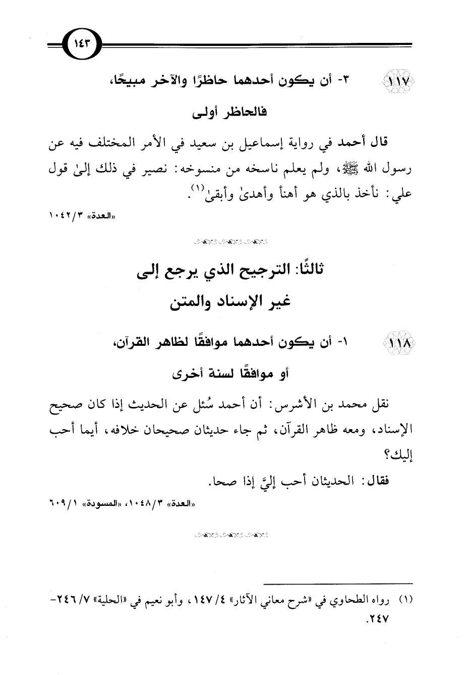 118 - 1 - أن يكون أحدهما موافقًا لطاهر القرآن، أو موافقًا لسنة أخرى