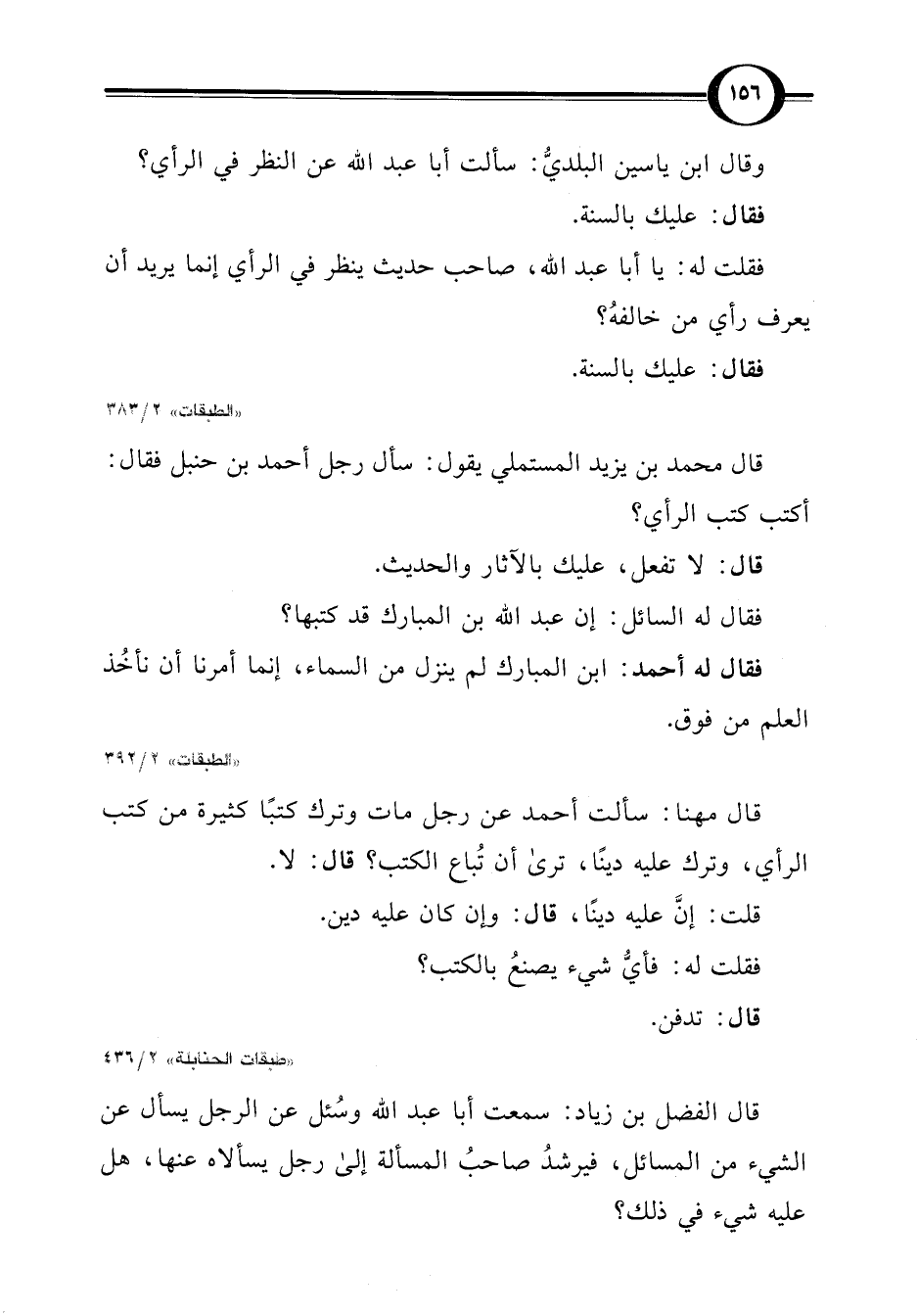قال محمد بن يزيد المستملي يقول: سأل رجل أحمد بن حنبل فقال: أكتب كتب الرأي؟