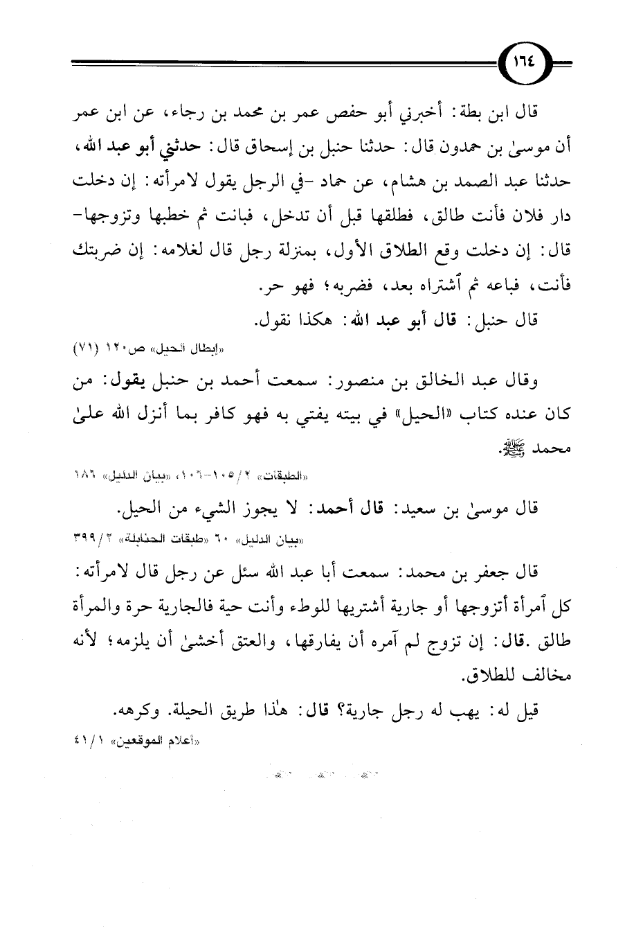 قال عبد الخالق بن منصور: سمعت أحمد بن حنبل يقول: من كان عنده كتاب "الحيل" في بيته يفتي به فهو كافر بما أنزل اللَّه على محمد -صلى اللَّه عليه وسلم-.