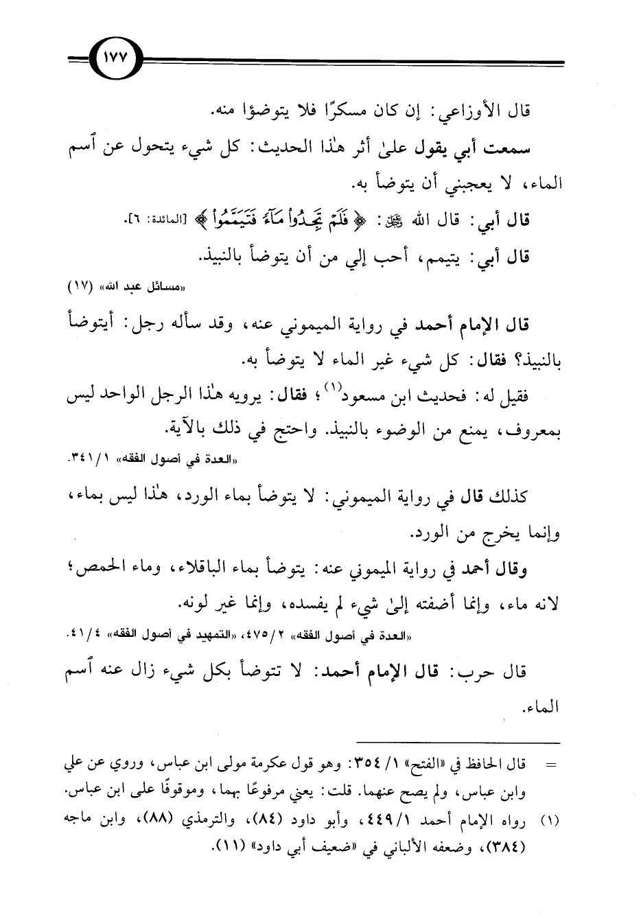 قال الإمام أحمد في رواية الميموني عنه، وقد سأله رجل: أيتوضأ بالنبيذ؟ فقال: كل شيء غير الماء لا يتوضأ به.