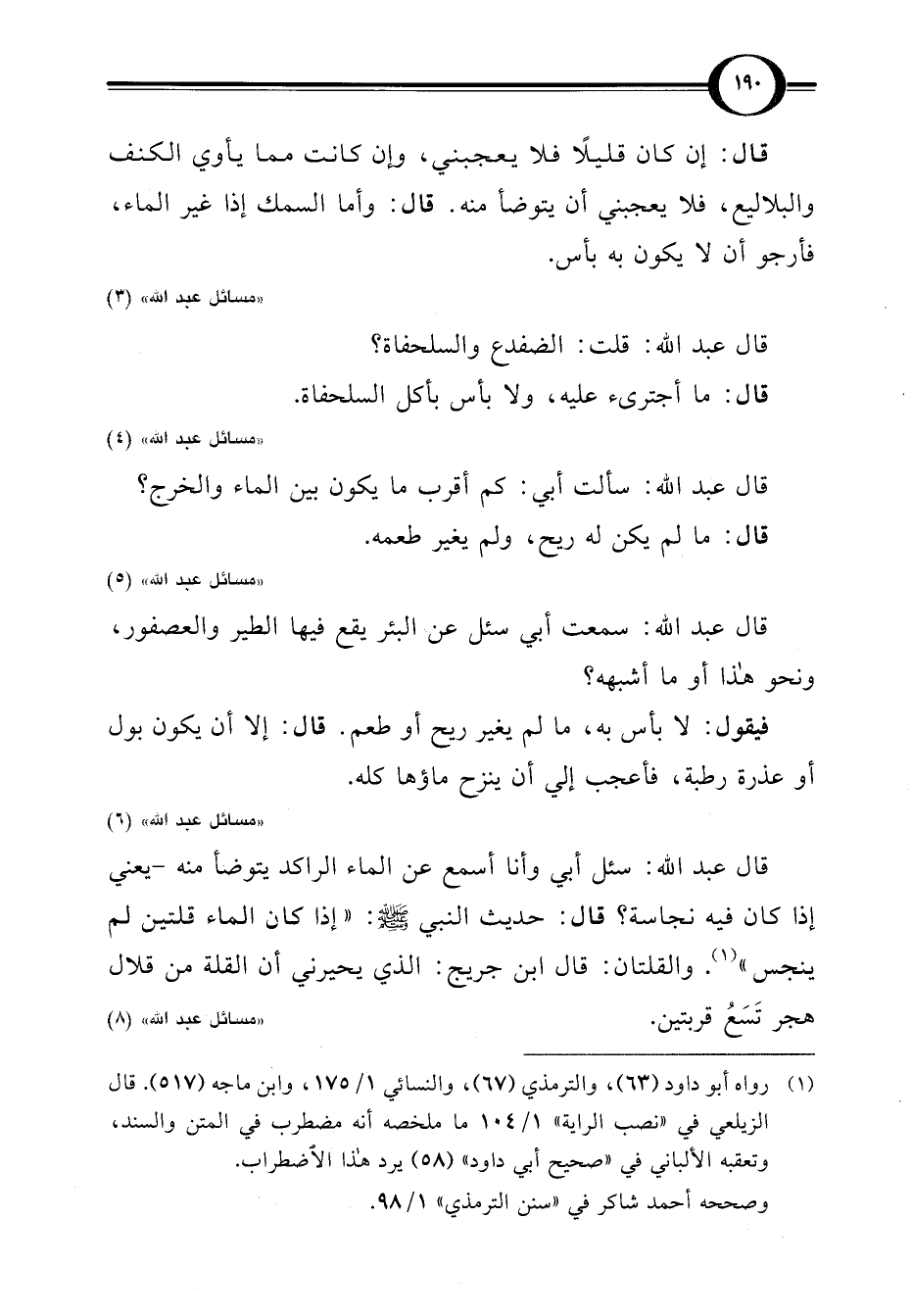 قال عبد اللَّه: سئل أبي وأنا أسمع عن الماء الراكد يتوضأ منه -يعني إذا كان فيه نجاسة؟ قال: حديث النبي -صلى اللَّه عليه وسلم-: "إذا كان الماء قلتين لم ينجس" (¬1). والقلتان: قال ابن جريج: الذي يحيرني أن القلة من قلال هجر تَسَعُ قربتين.