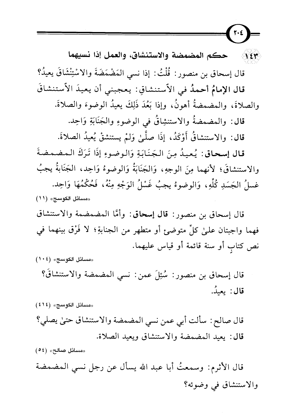 قال إسحاق بن منصور: قال إسحاق: وأمَّا المضمضمة والاستنشاق فهما واجبتان على كل متوضئ أو متطهر من الجنابةِ؛ لا فَرْق بينهما في نص كتابٍ أو سنة قائمة أو قياس عليهما.