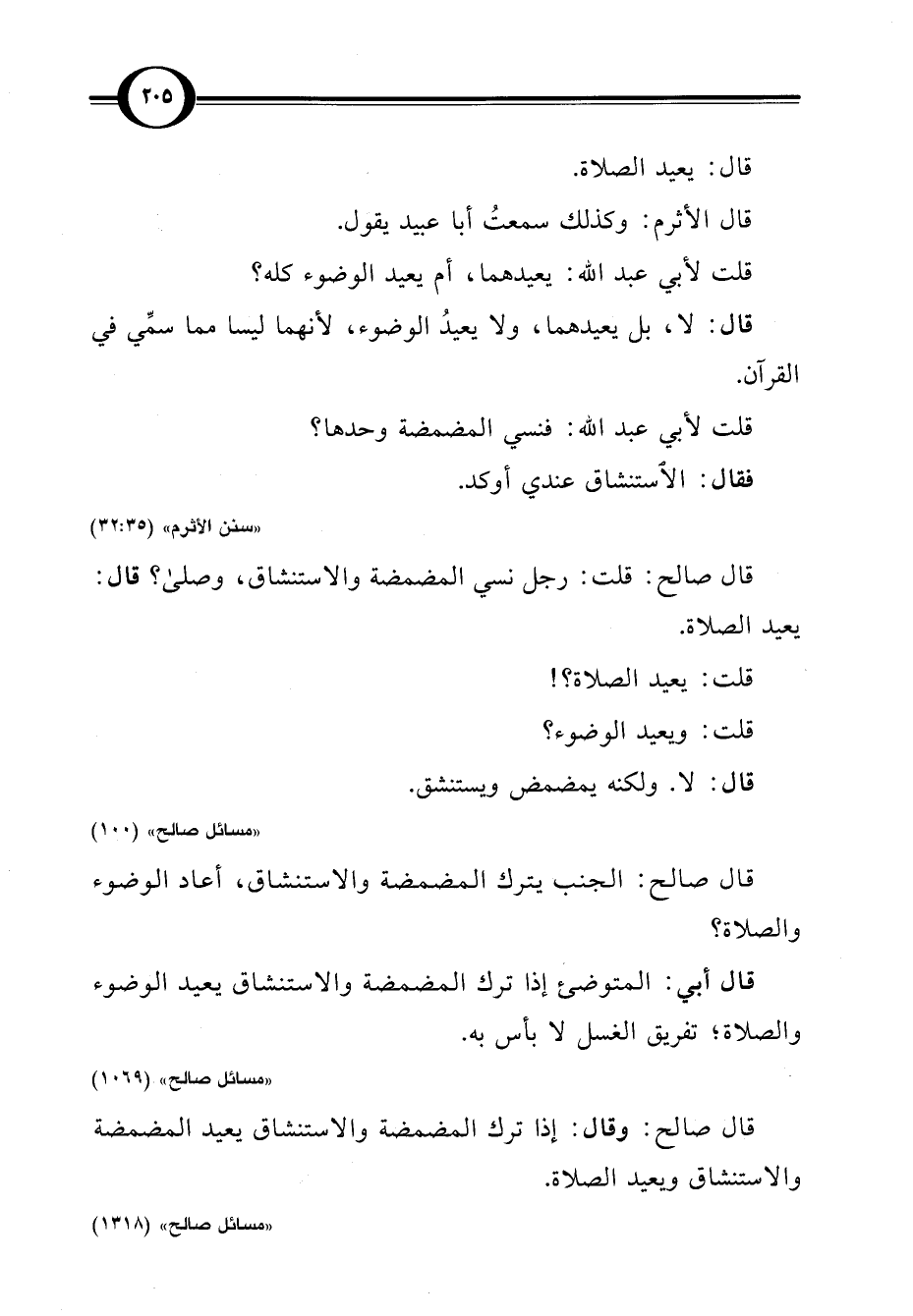 قال صالح: الجنب يترك المضمضة والاستنشاق، أعاد الوضوء والصلاة؟
