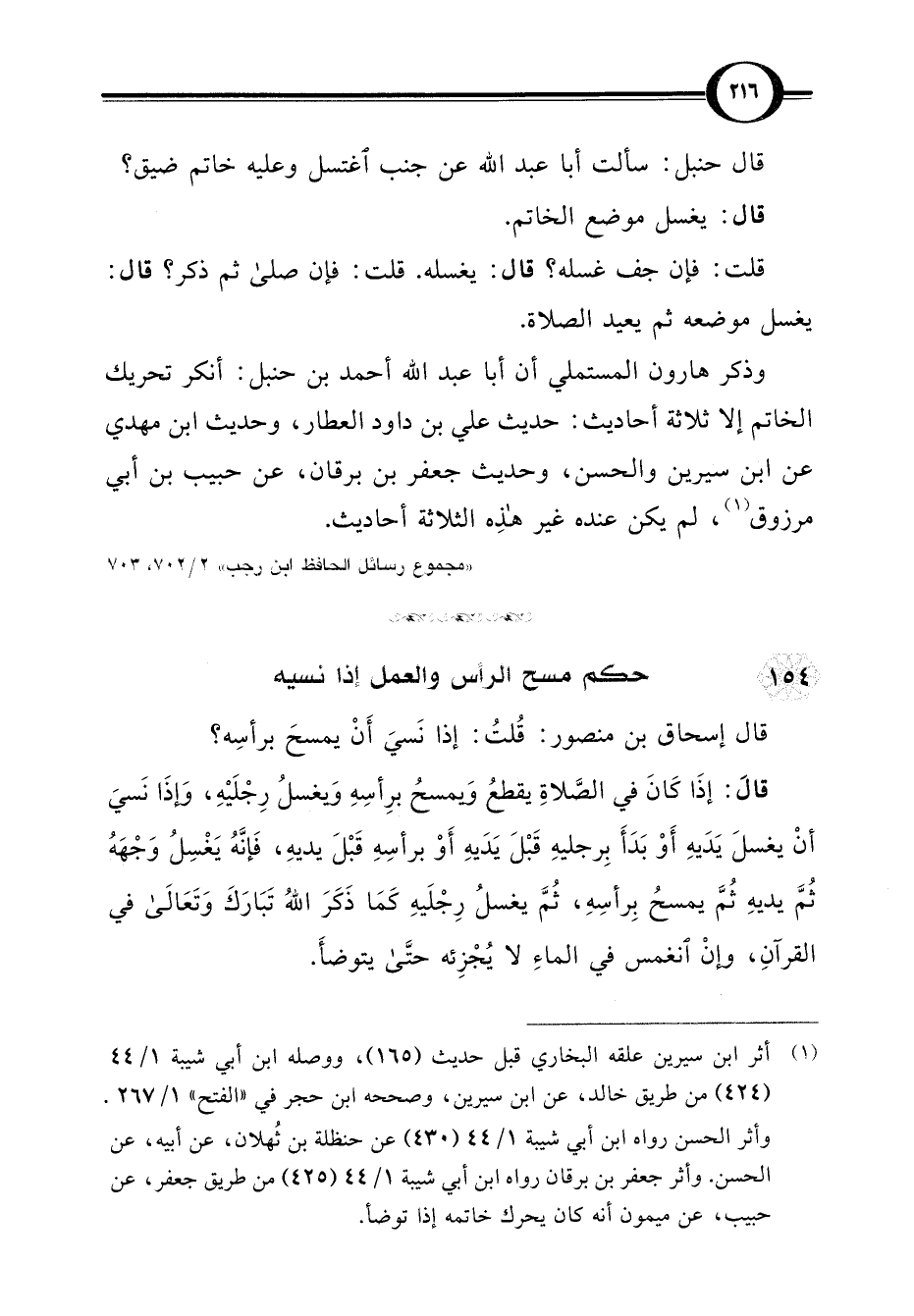 (¬1) أثر ابن سيرين علقه البخاري قبل حديث (165)، ووصله ابن أبي شيبة 1/ 44 (424) من طريق خالد، عن ابن سيرين، وصححه ابن حجر في "الفتح " 1/ 267. وأثر الحسن رواه ابن أبي شيبة 1/ 44 (430) عن حنظلة بن ثُهلان، عن أبيه، عن الحسن. وأثر جعفر بن برقان رواه ابن أبي شيبة 1/ 44 (425) من طريق جعفر، عن حبيب، عن ميمون أنه كان يحرك خاتمه إذا توضأ.